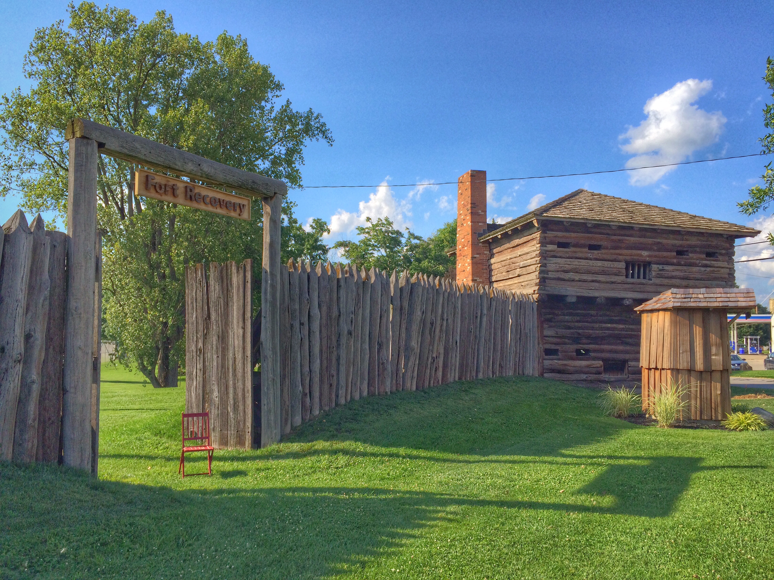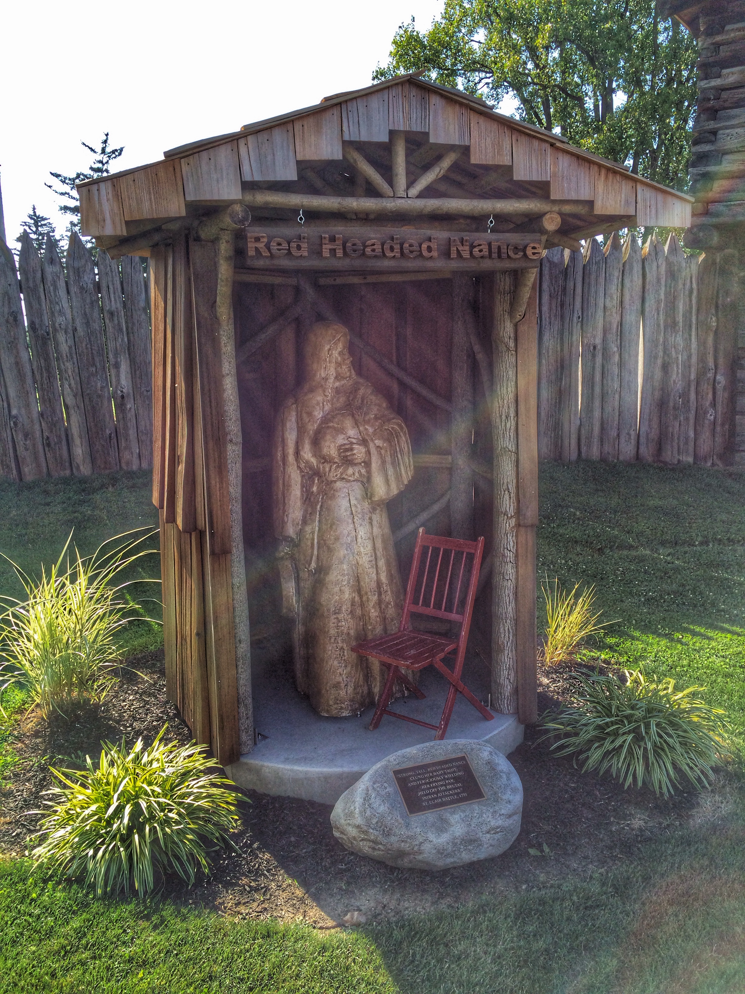 This carved sculpture, called “Red Headed Nance” stands next to the fort. The plaque underneath reads “Strong, tall, Red Headed Nance clung [sic] her baby tight, and ferociously wielding her frying pan, held off the brutal Indian attackers. St. Clair battle, 1791.”