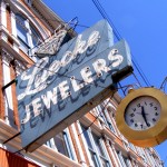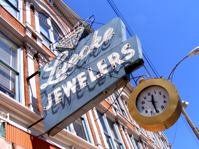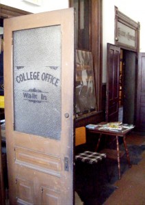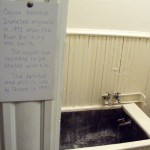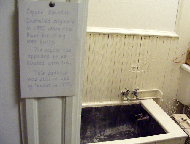 The lower floor of the building (which I didn’t see) was once a jewelers. The middle floor had eight apartments in one of which my guide had her hair done when she was 15 or 16. (She’s 93 now.) There were signs all over the place pointing to “interesting” features of the building — my guide took me to all of them. She directed me to take photographs of the transoms, the old bathtub, the built-in apartment shelving and the original linoleum flooring.