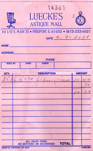 Then she took me to rooms she’d arranged and showed me how neat they were. She kept on talking long after she ran out of things to say. When she started through the rooms a third time pointing out individual items for sale, I gently broke away. Earlier, up in the ballroom, I’d spotted a red, wooden folding chair that had a lot of personality.