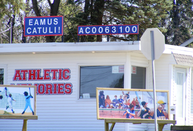 The sports store across the street even had the Cubs’ tragic numbers and the slogan “Eamus Catuli!”  which in Latin literally means “Go Whelps!”