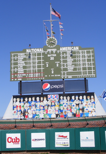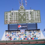 There is ivy on the outfield walls grown from Wrigley Field cuttings. The Cubs’ retired numbers fly from the flagpoles. A basket lines the outfield walls and signs mark the location of Sheffield and Waveland Avenues. For whatever reason, the statue of Harry Carey is missing from its pedestal, but I’m not sure this is a bad thing. One bit that isn’t very authentic is that the scoreboard has the Cubs beating the Mets 21-0.