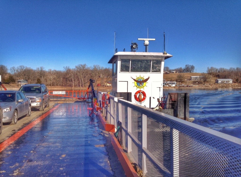 The Golden Eagle Ferry crosses the Mississippi River between southern Calhoun County, Illinois and St. Charles, Missouri. It is not free — it cost us $15 for a round trip. There were about six vehicles on the barge on both trips. The tow boat/barge arrangement was the same as on the Brussels Ferry.