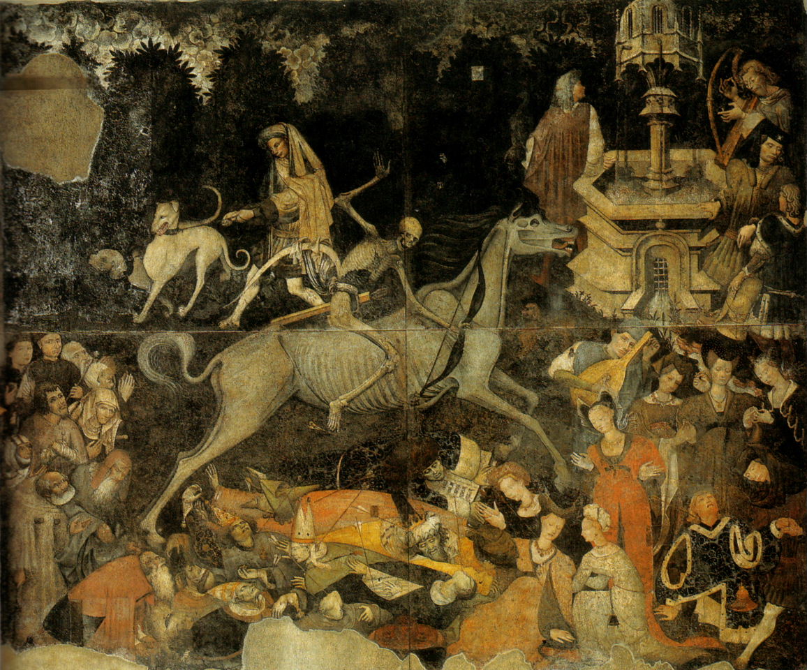 The central figure is Death riding a skeletal horse. He’s passing by the poor and sickly people and stomping to death the wealthy and the members of the clergy. (Those already dead are pretty much the same color as the horse.) On the right are men and women living in luxury. They’re aware of death’s approach but can do nothing about it and don’t even seem to be trying very hard. Lengthy studies have been done on the fashions worn by the rich in this painting, but I’ll spare you the details.