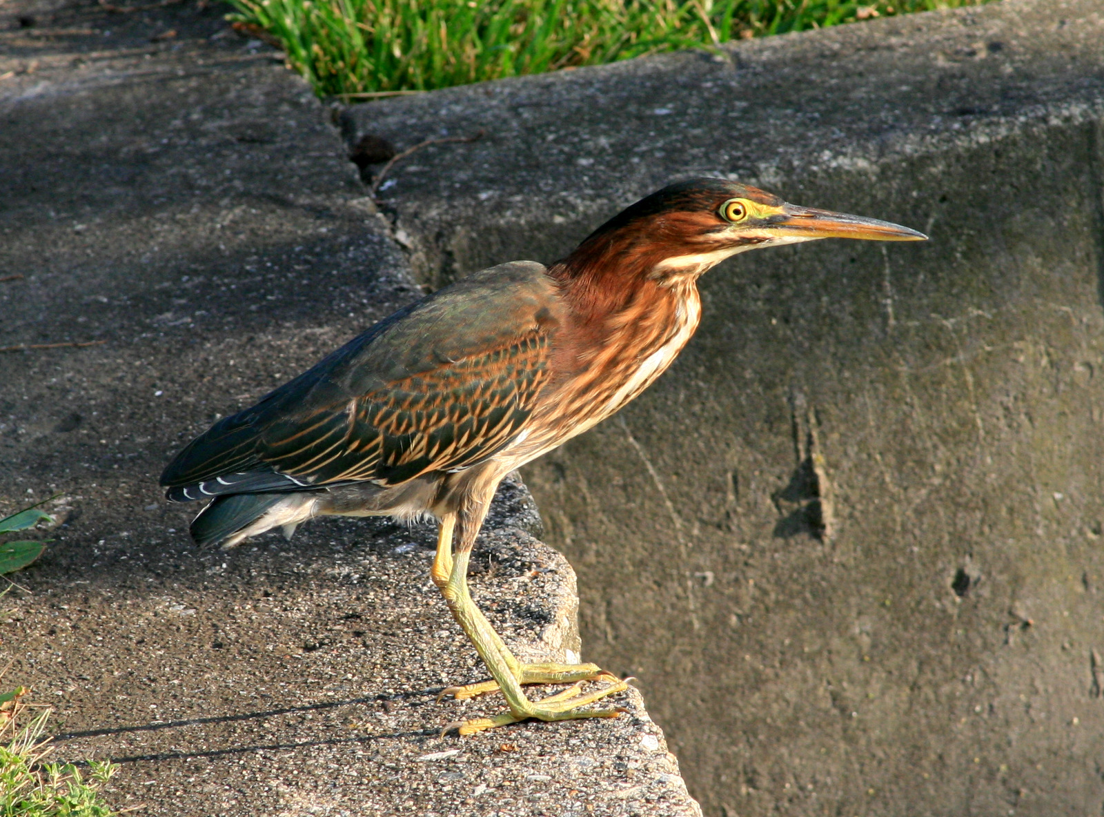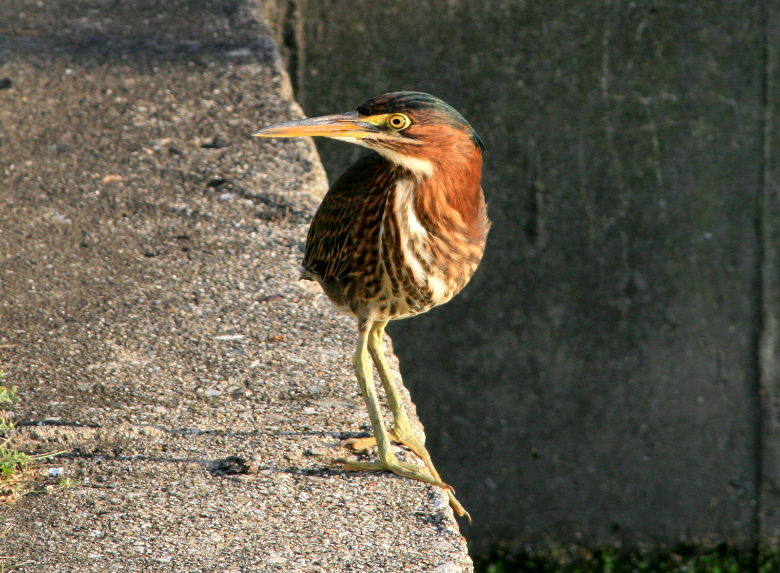 I took a stroll downtown the other night and walked though the small park along Route 14. On a cement wall maybe 20 yards from busy rush-hour traffic a Green Heron was doing what Green Herons do — standing quietly waiting for something tasty and oblivious to wander close enough to grab.