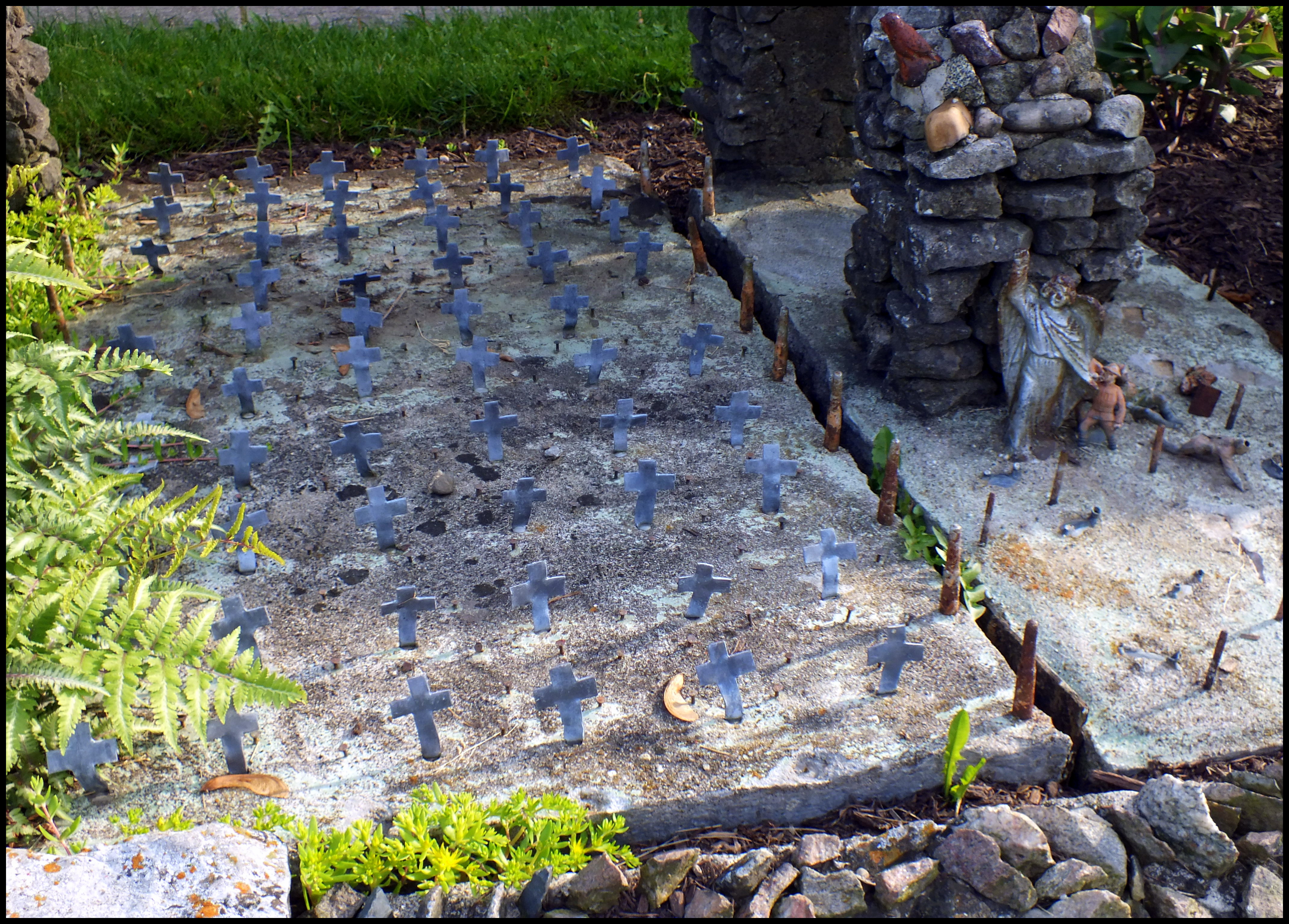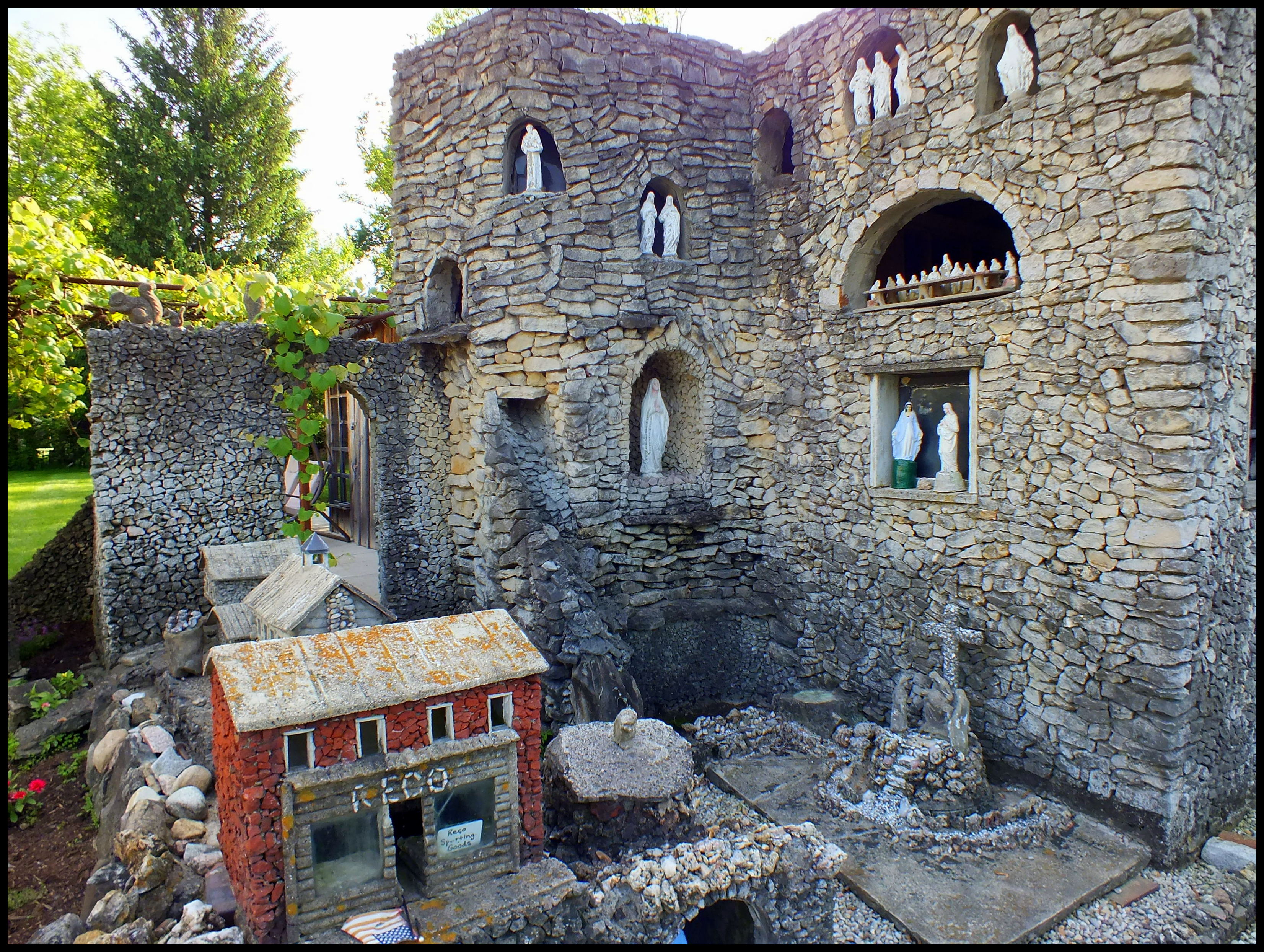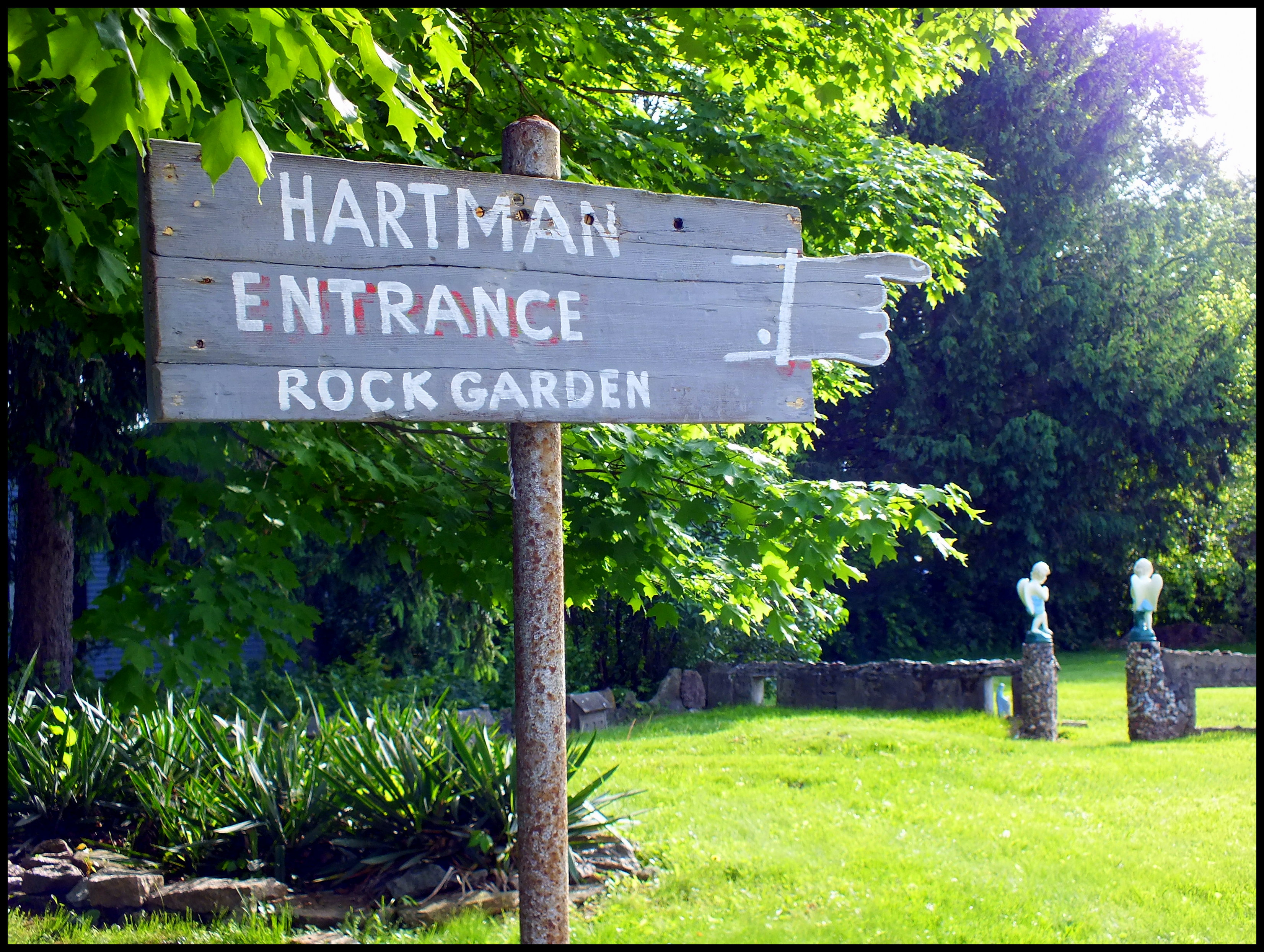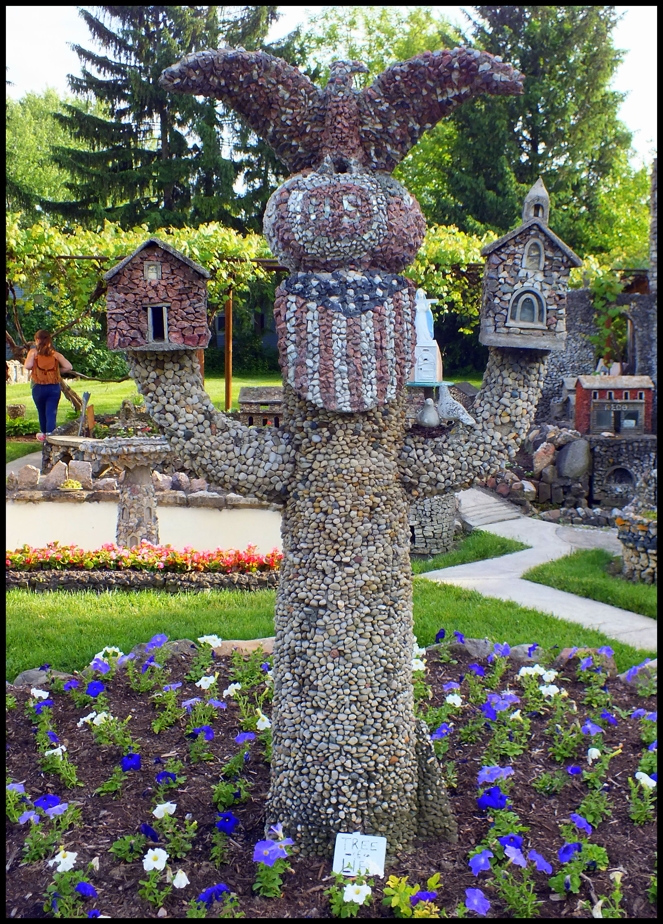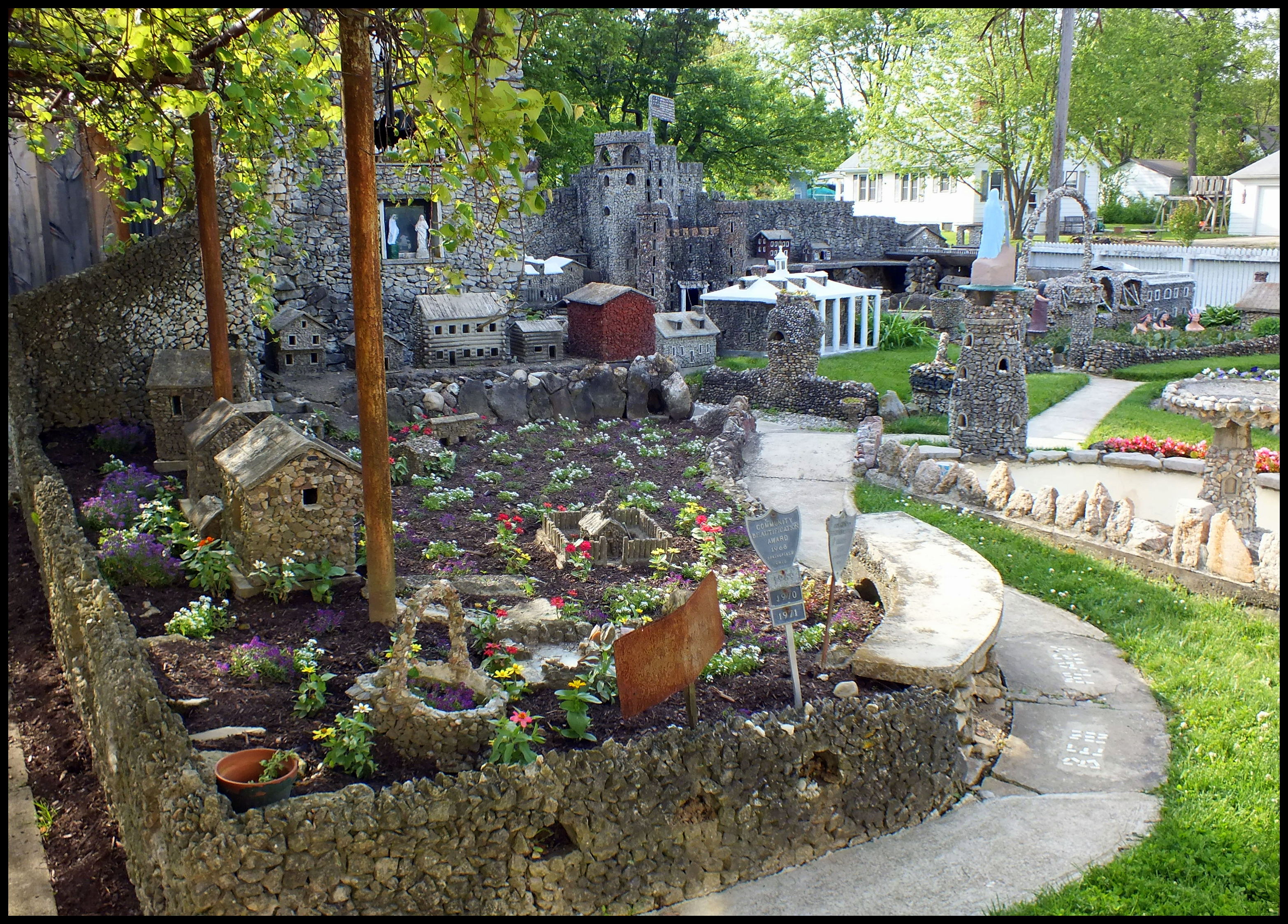 Harry “Ben” Hartman was a mold-maker who lived in a rural area outside Springfield, Ohio. He lost his job during the Great Depression and decided to spend his free time working in his yard. For the next 12 years, until he died at the age of 60 in 1944, he created a rock garden filled with religious and patriotic sculptures.