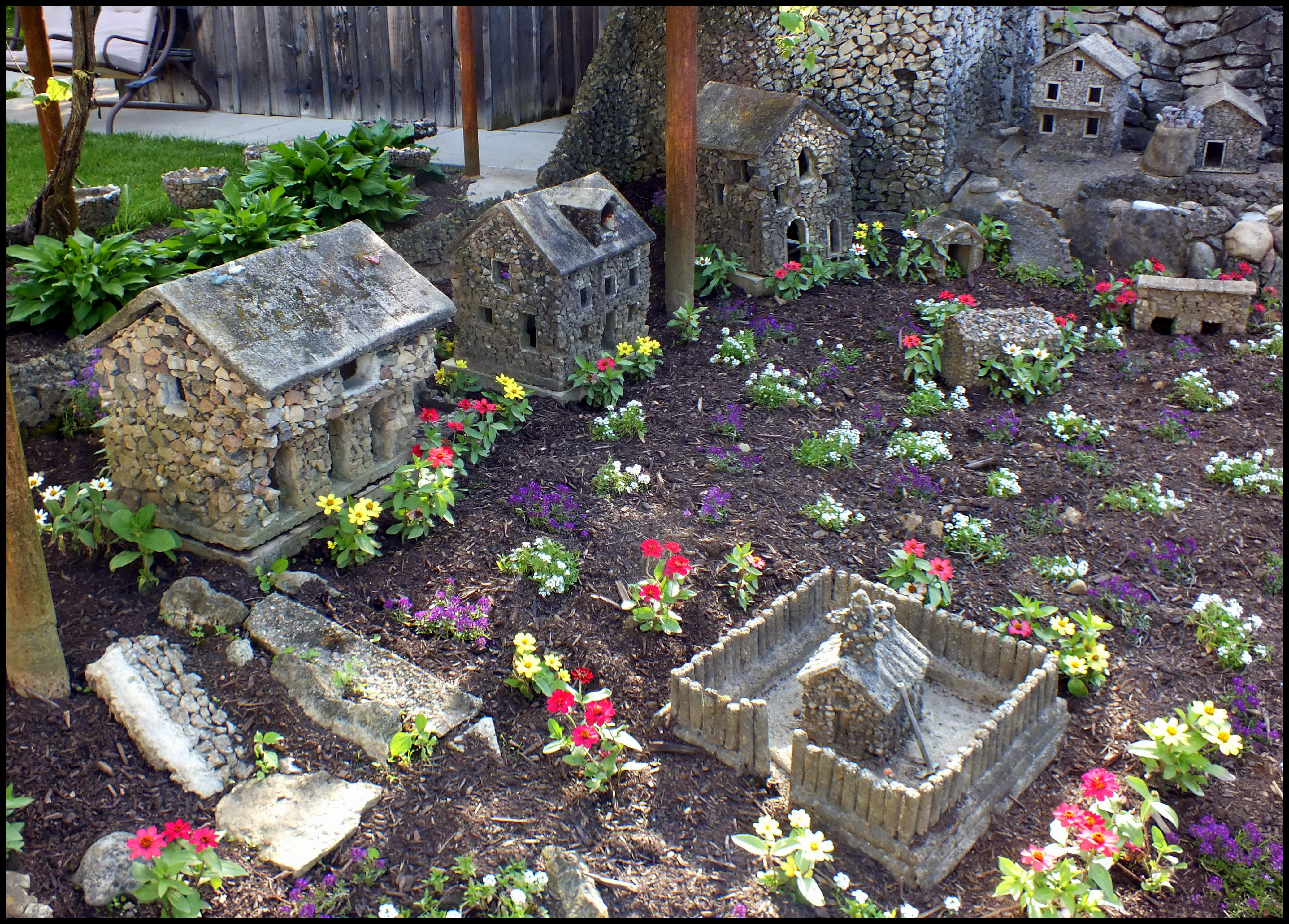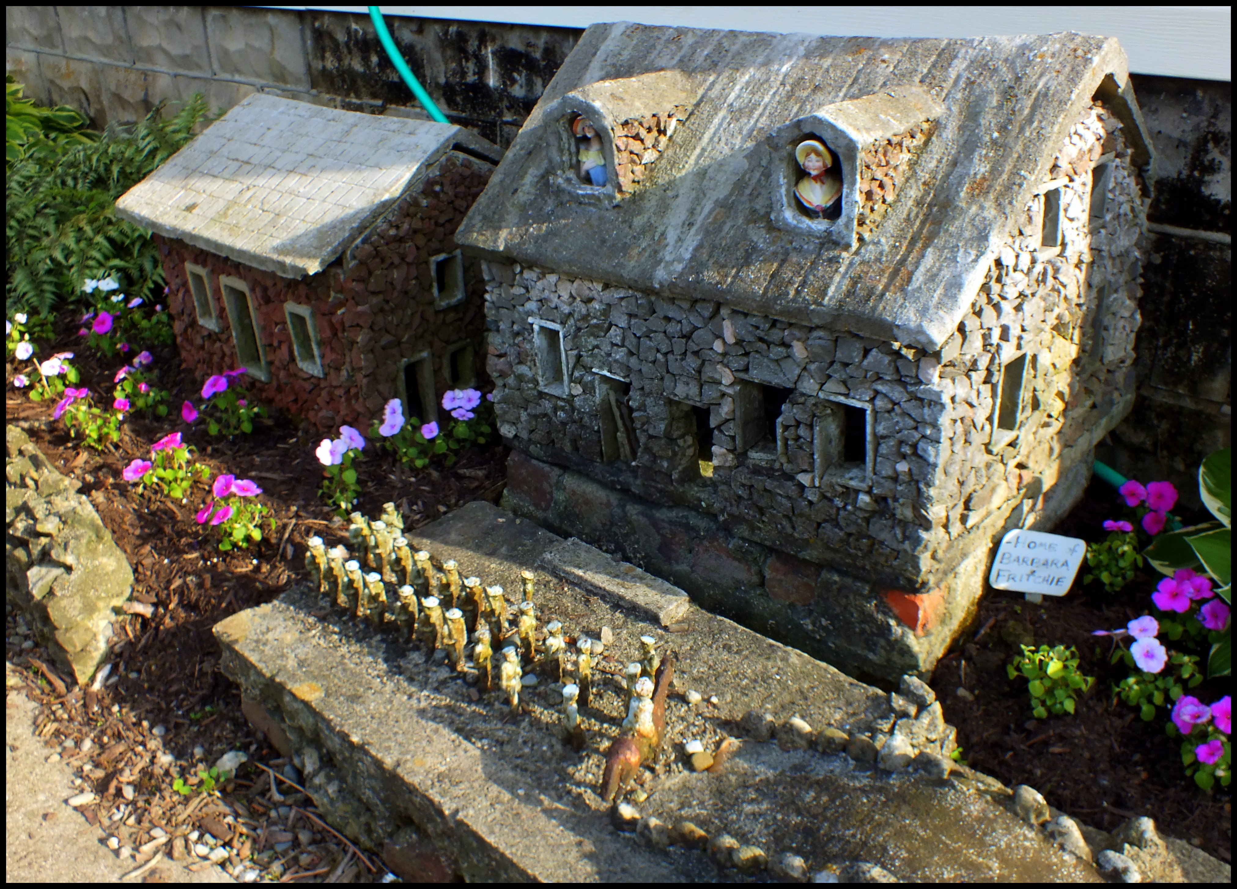 Behind it is the Fishing Pond, Ben’s first project. The birdbath in the middle once held miniature Three Little Pigs and the North Pole.