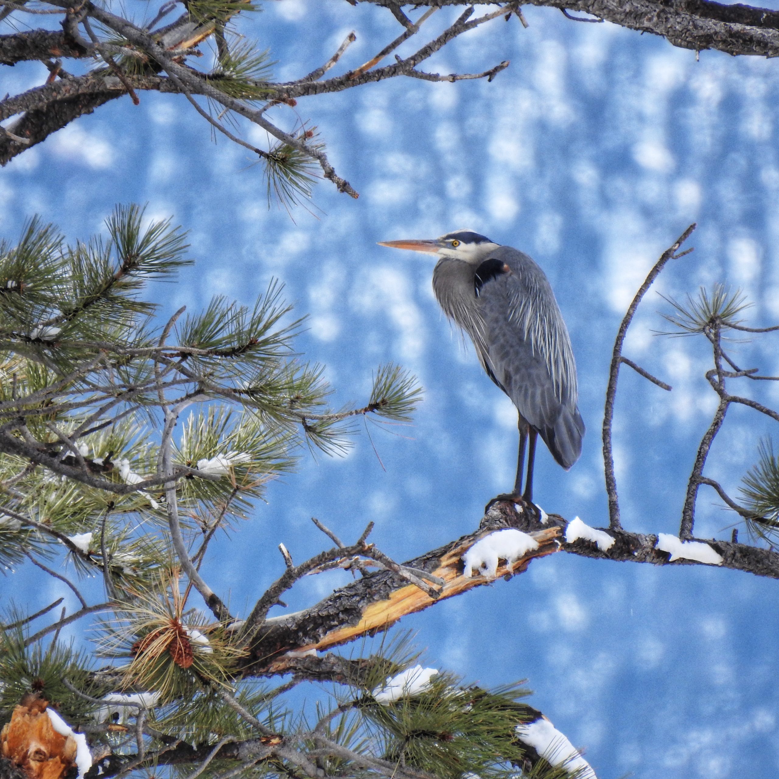 The birds were all the usual suspects. I unintentionally flushed a Great Blue Heron from the tiny pond down below the school. It flew up into a pine and hunkered down. I have plenty of photos of Great Blue Herons, so I didn’t make any particular effort, but when it allowed me to get within maybe 50 yards, I snapped off a few shots. One of them turned out pretty good.