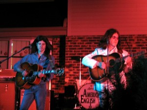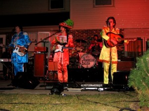 The other thing that got me on this kick was an invitation by our friends Wayne and Holly to crash a birthday party of one of their friends. For his wife’s birthday, the husband hired the Beatles tribute group American English to give a private concert in their backyard. There were perhaps 75 adults there, and maybe that many kids (but most of the kids were playing on some rented inflatables and kept out of the way). The band put on a full show, changing outfits to reflect the Beatles’ different stages. The show lasted two hours and would have gone on for three more songs but for a short, hard rain storm that made everyone scramble. The band members were very good musicians (I’ve been told) and made things as authentic as possible — using the same style instruments and singing the same parts. The guy who played Paul even played left-handed and went barefoot during the Abbey Road set. (I had already started reading the book when we were invited to the concert.)