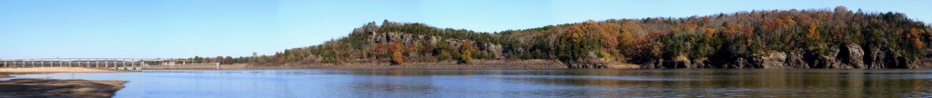 I walked downstream until I ran out of park. There were sandbars along the shore for as far as I could see, and nobody else was around. I hopped a short fence and walked along the river for about a mile. I took this pan looking back at the dam from the west side of the river. I think it’s the longest successful pan I’ve ever posted. You can click on it twice to enlarge if you wish.