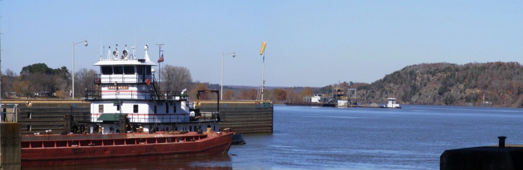 Here’s a view looking north along the river. The towboat on the left is waiting to lock through. The row of barges it was pushing was so long that only half could fit in the lock at a time. The boats and barges in the background were there all day dredging or building up the shore or somesuch.