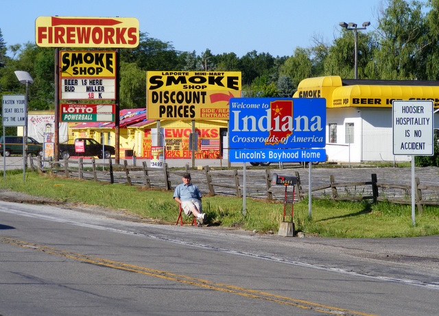There must be at least 50 billboards along Interstate 80-94 in Illinois that advertise fireworks for sale in Indiana. I find this a bit weird, considering that fireworks are illegal in Illinois. Does the government of my fine state expect its law-abiding citizens to stop at the border before re-entering the state and explode everything they’ve purchased?