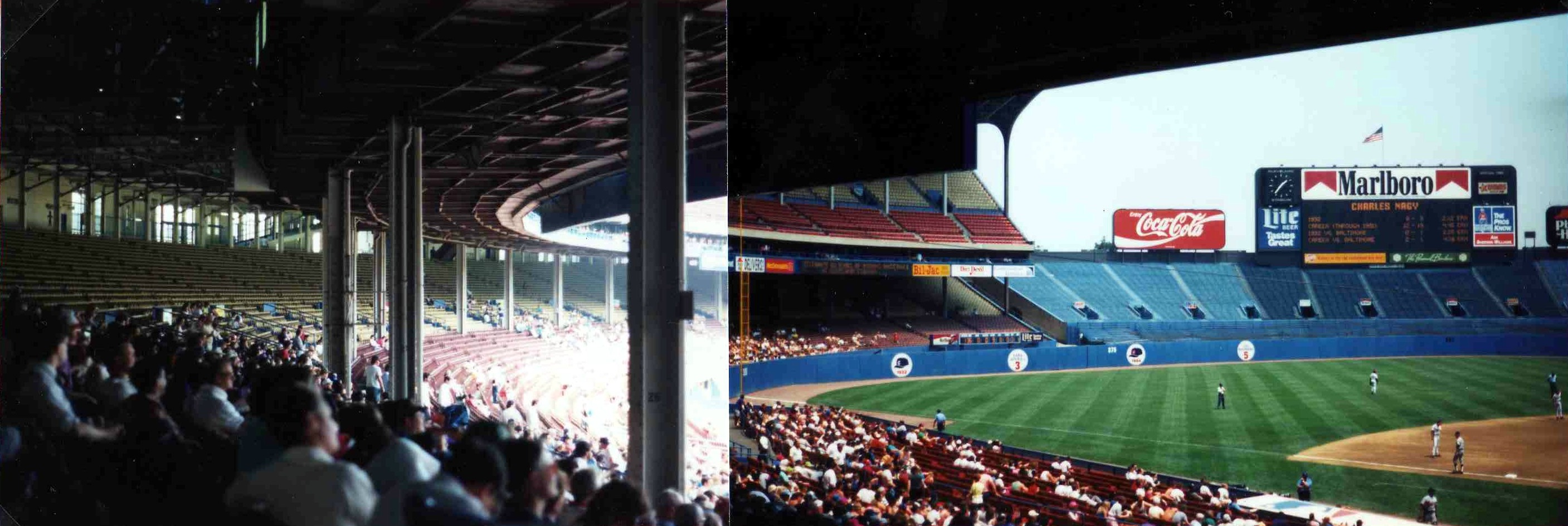 I took the left-hand photo (below) looking down from the left-field stands into center field. Notice how far it is from the fence to the seats.