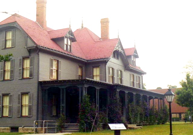 We visited the Cleveland area on a hazy, humid day full of summer thunderstorms. One ended about an hour before we arrived at Garfield’s house and another one rumbled through 20 minutes after we left. We were the only ones on our tour. We started with a slide show in the visitor center and were then shooed up to the house to meet our guide — Ed. He came out of the house to meet us as we approached. He gave an enthusiastic talk as we walked across the famous front porch where Garfield spoke during his campaign.