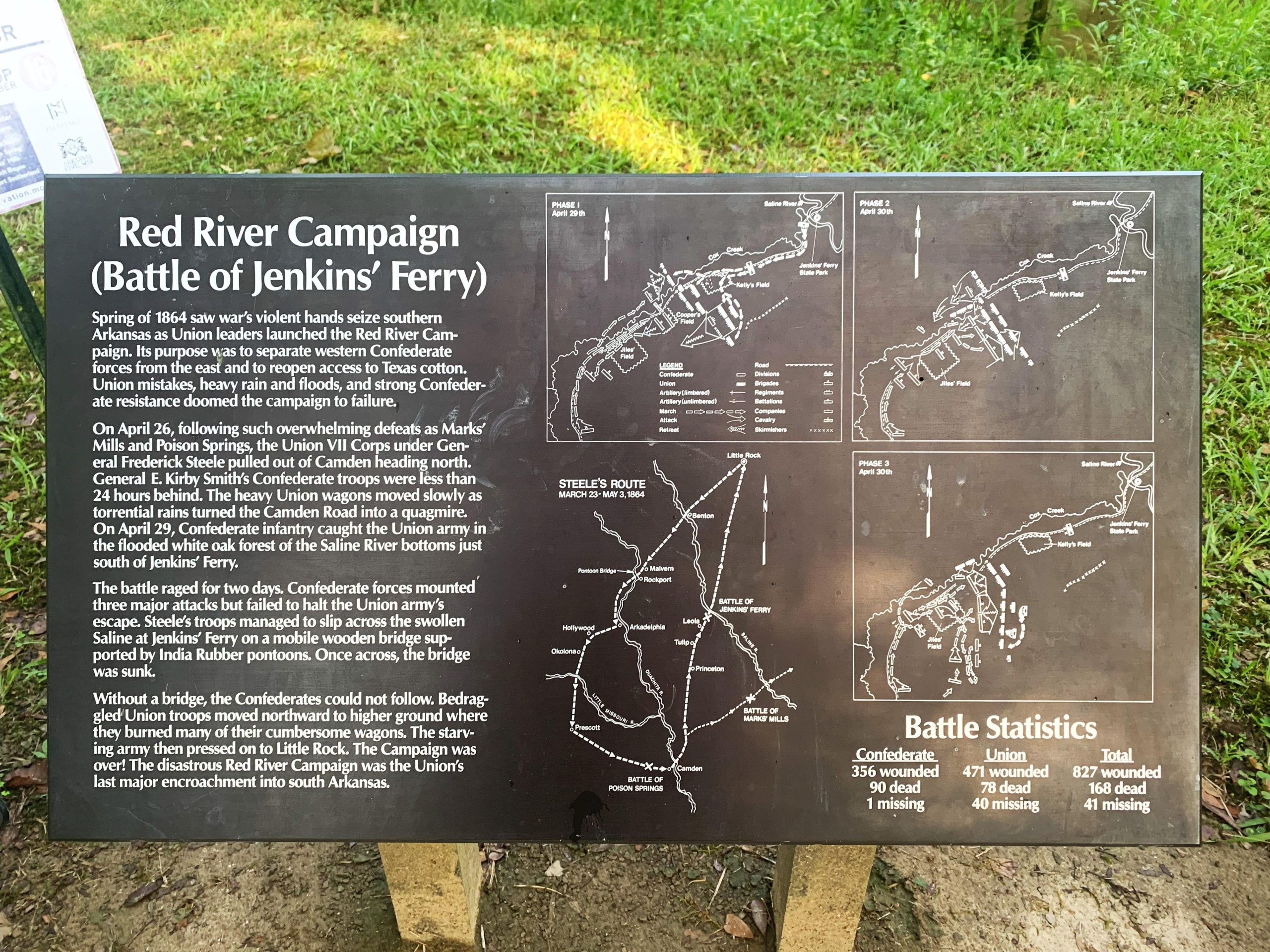 There was also this monument, which gives some idea of how well the battlefield is maintained. It reads, “Erected in memory of the soldiers of the Confederacy, who gave their lives for the cause at the battle of Jenkins Ferry, April 30, 1984. Dedicated September 19, 1938, by the James F. Fagan and Jenkins Ferry Chapter of the United Daughters of the Confederacy. We honor their valor and sacrifice.”