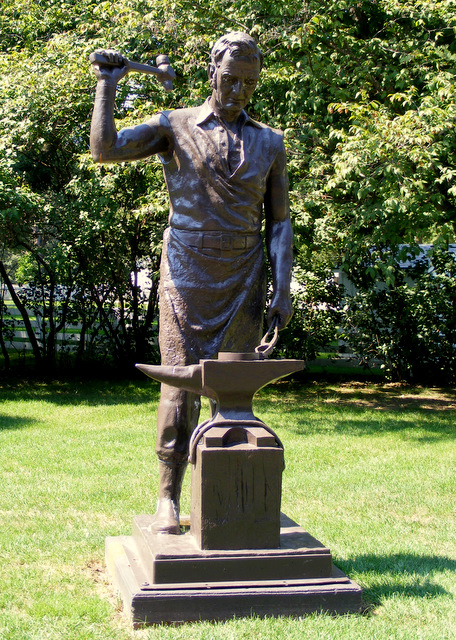The last stop on the tour was this statue of Deere. As near as I can reproduce our guide’s words, she said, “The anvil is too low for the height of the blacksmith, the anvil is also facing the wrong way. The horn goes on the blacksmiths left, no matter if he is right- or left-handed. And no blacksmith raises his hammer above his shoulder like that. But it’s a nice statue.”