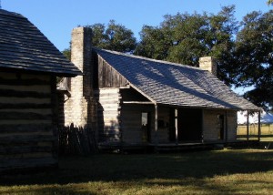 The Johnson cabin was built in the dog-trot style. That means that the two rooms are separated by an open space that is roofed but otherwise open to the weather. Supposedly the name came about because a dog could trot through the opening, but frankly, that seems rather silly to me. Why a dog? A cow or an armadillo or even a squirrel could trot through there just as easily. For that matter, I considered trotting through it myself.