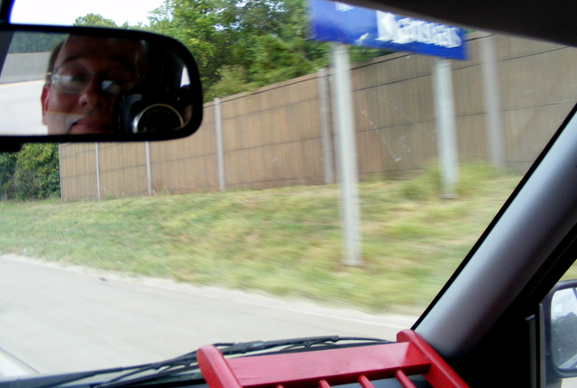 Too late, it occurred to me that, in my state sign pictures, I want the sign, the chair AND me. So I decided to go back the next morning and try again. I put the chair in place, right-side up this time, before I got on the interstate and had my camera all ready. I tilted the mirror so I could get my face in the shot. Everything was ready.