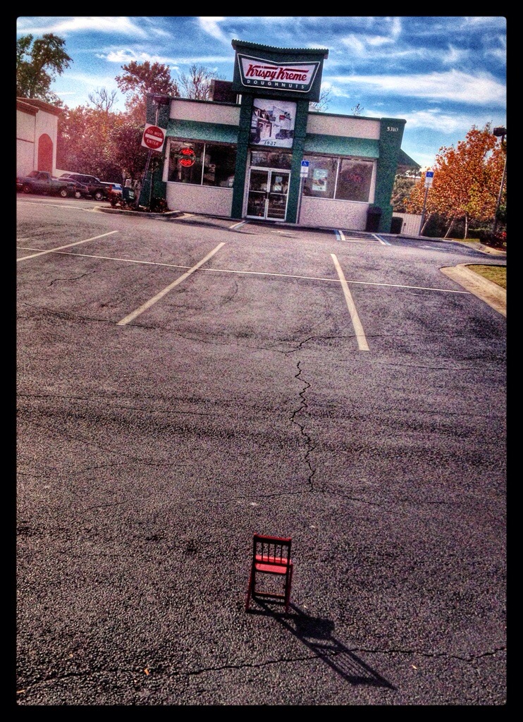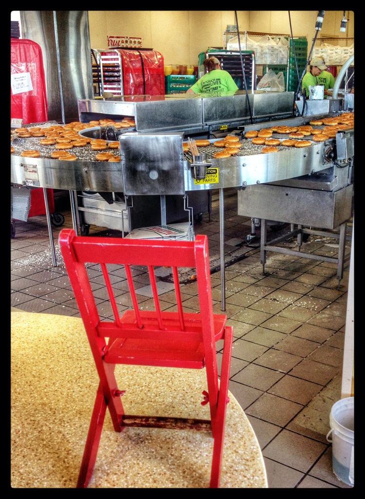 After all the morning’s excitement, we still hadn’t eaten breakfast. I spotted a Krispy Kreme across Irlo Bronson Memorial Highway from Eli’s Orange World and headed over. I decided to buy two donuts — raspberry filled (my favorite) and chocolate cheesecake (available for a limited time and not great). Just as I ordered, the woman behind the counter gave us each a free regular donut. Three donuts were one donut too many, but I heroically downed them all.