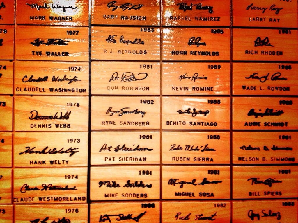 We exited through the gift shop, but I didn’t buy anything because they’d already given me a souvenir bat. The walls of the lobby were filled with the signatures of Major League players as they appear on bats. The signatures are taken from the contracts the players sign with the manufacturer. I found Ryne Sandberg’s autograph.