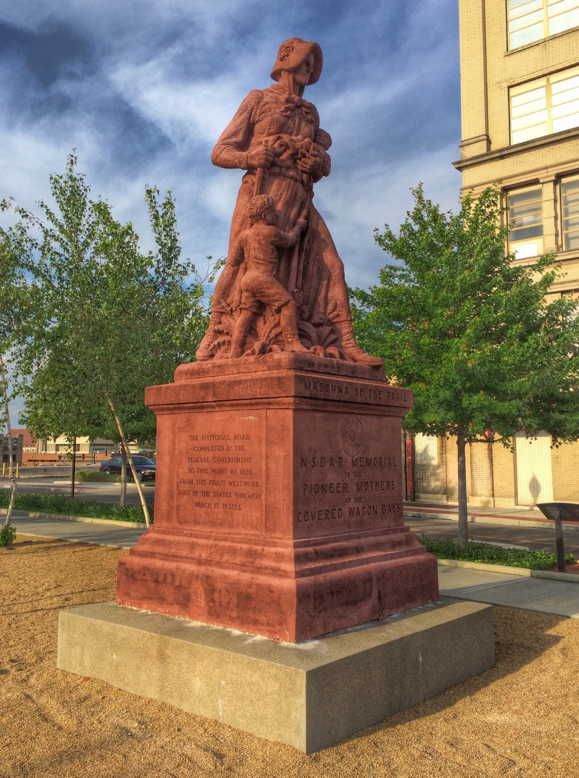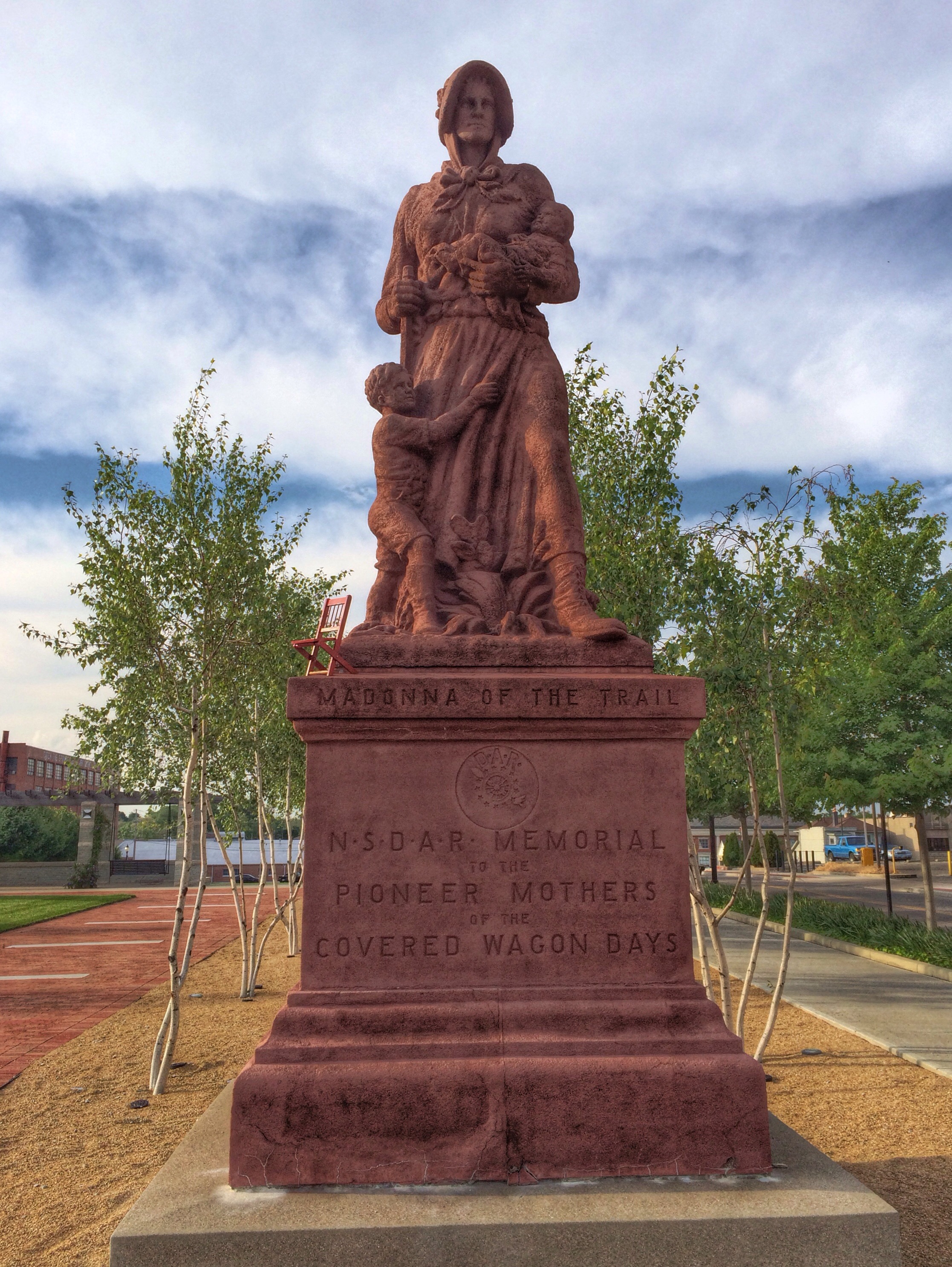 In 1928, the Daughters of the American Revolution commissioned 12 identical statues, one for each state along the route of the National Old Trails Road. The monuments are intended to celebrate the spirit of pioneer women.