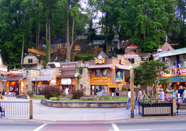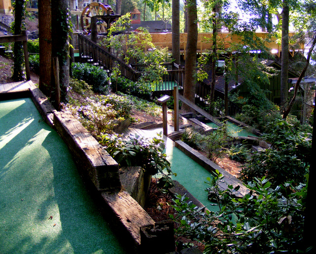 There were several miniature golf courses in Gatlinburg, and in the evening we decided to play one of them. We picked Fort Fun, which had two courses running down the hillside above main street.