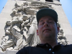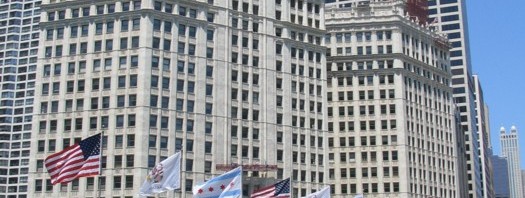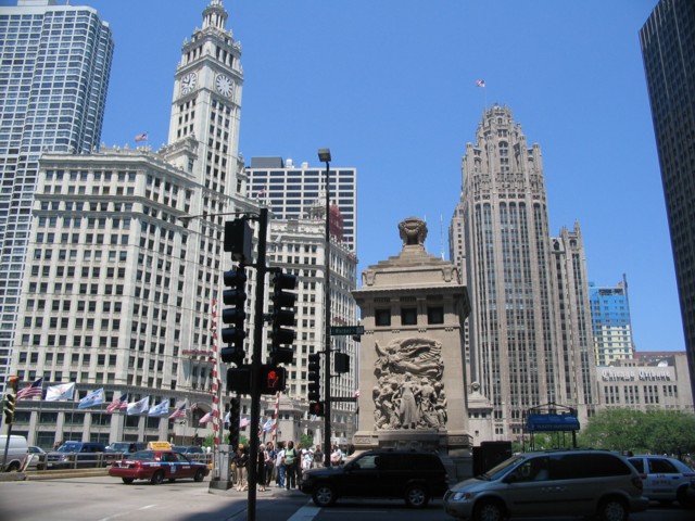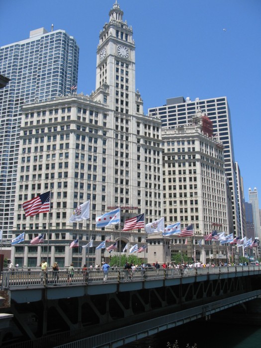 After enjoying lunch at Pizzaria Uno, we headed for the Art Museum, crossing the Chicago River on the Michigan Avenue Bridge. I was planning on taking a bunch of pictures, but I was afraid to get run over. I finally stopped and leaned on the railing while my wife walked around to the “bank” and took this shot. I’m in a black shirt beneath the second U.S. flag.