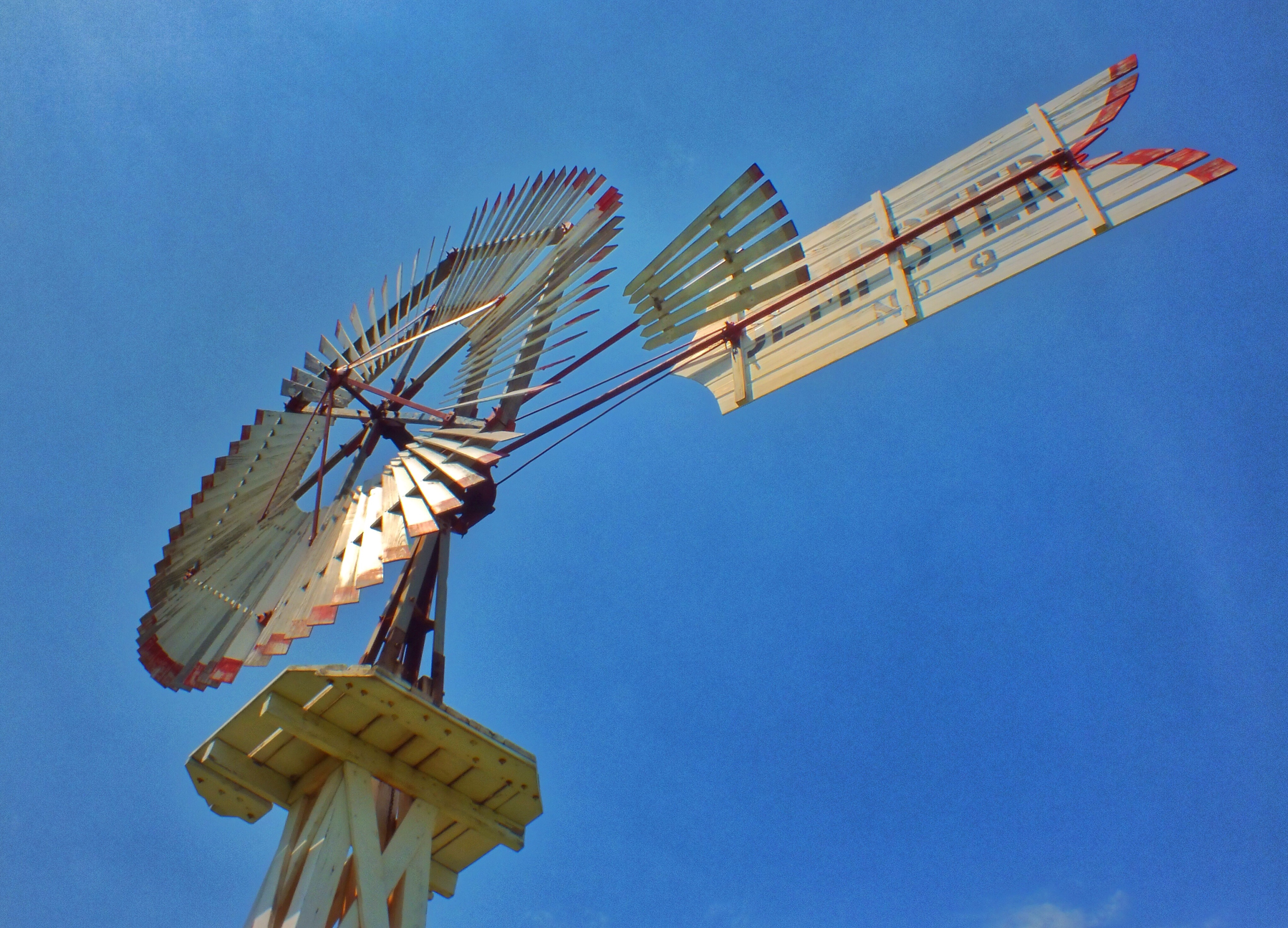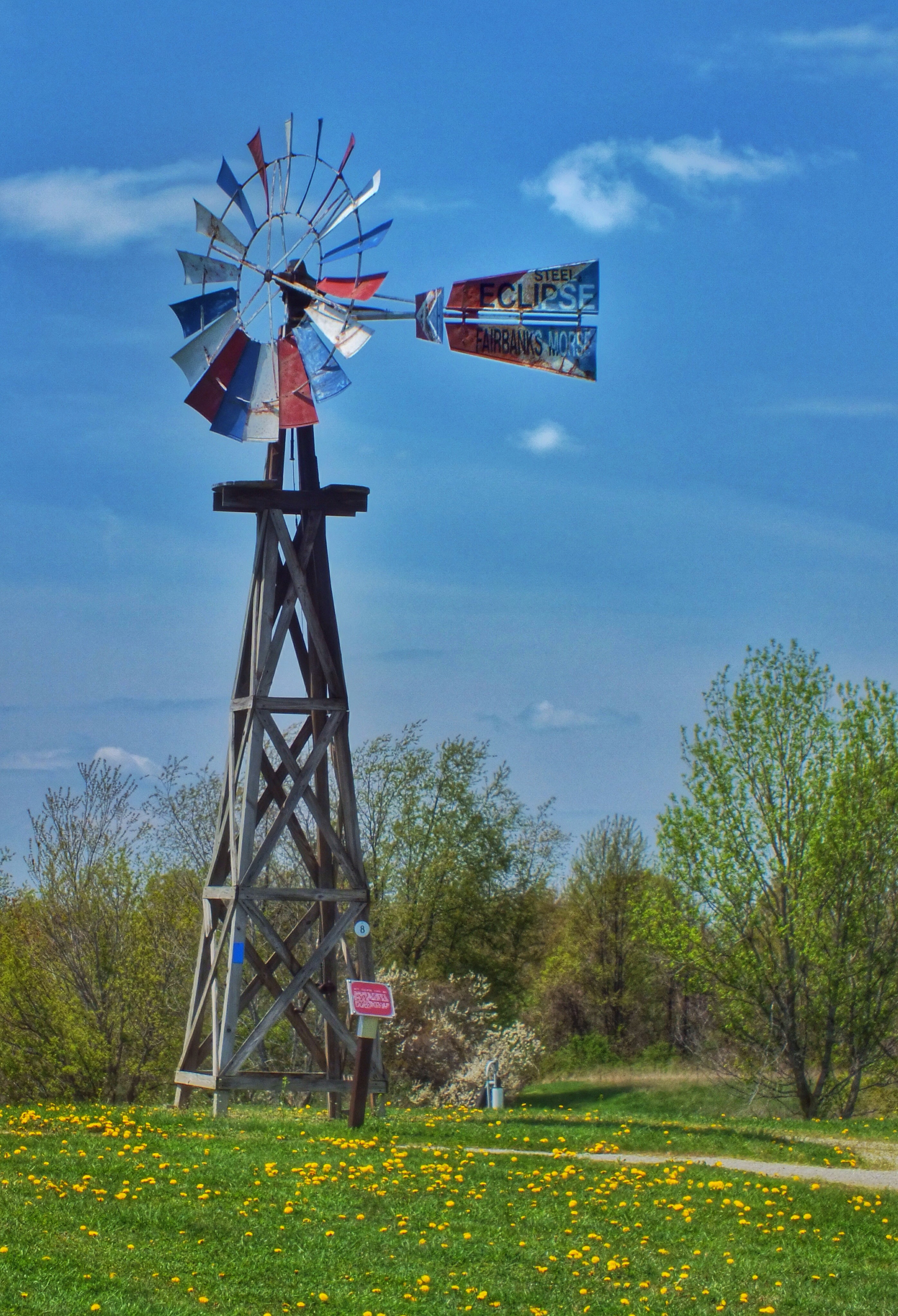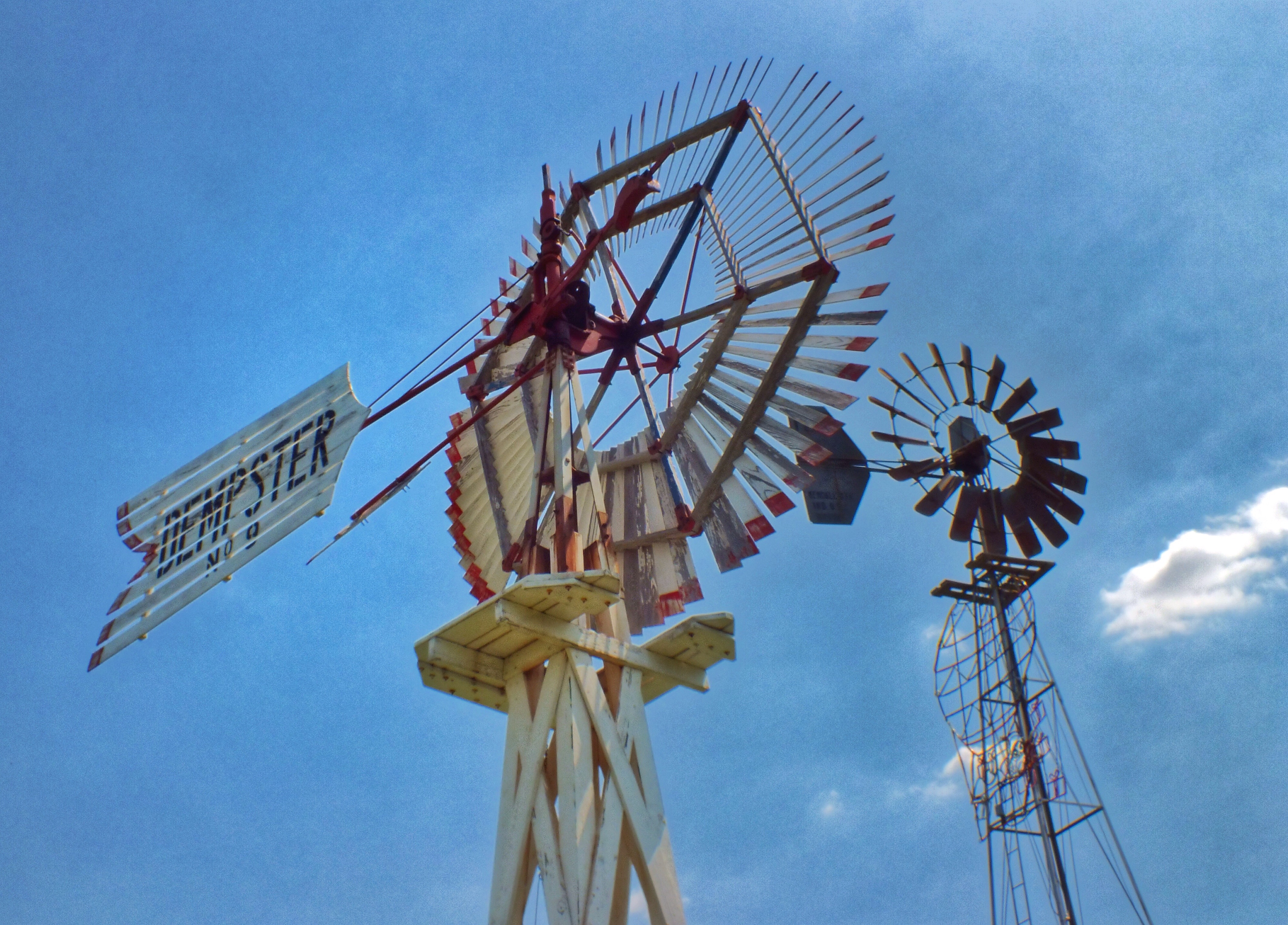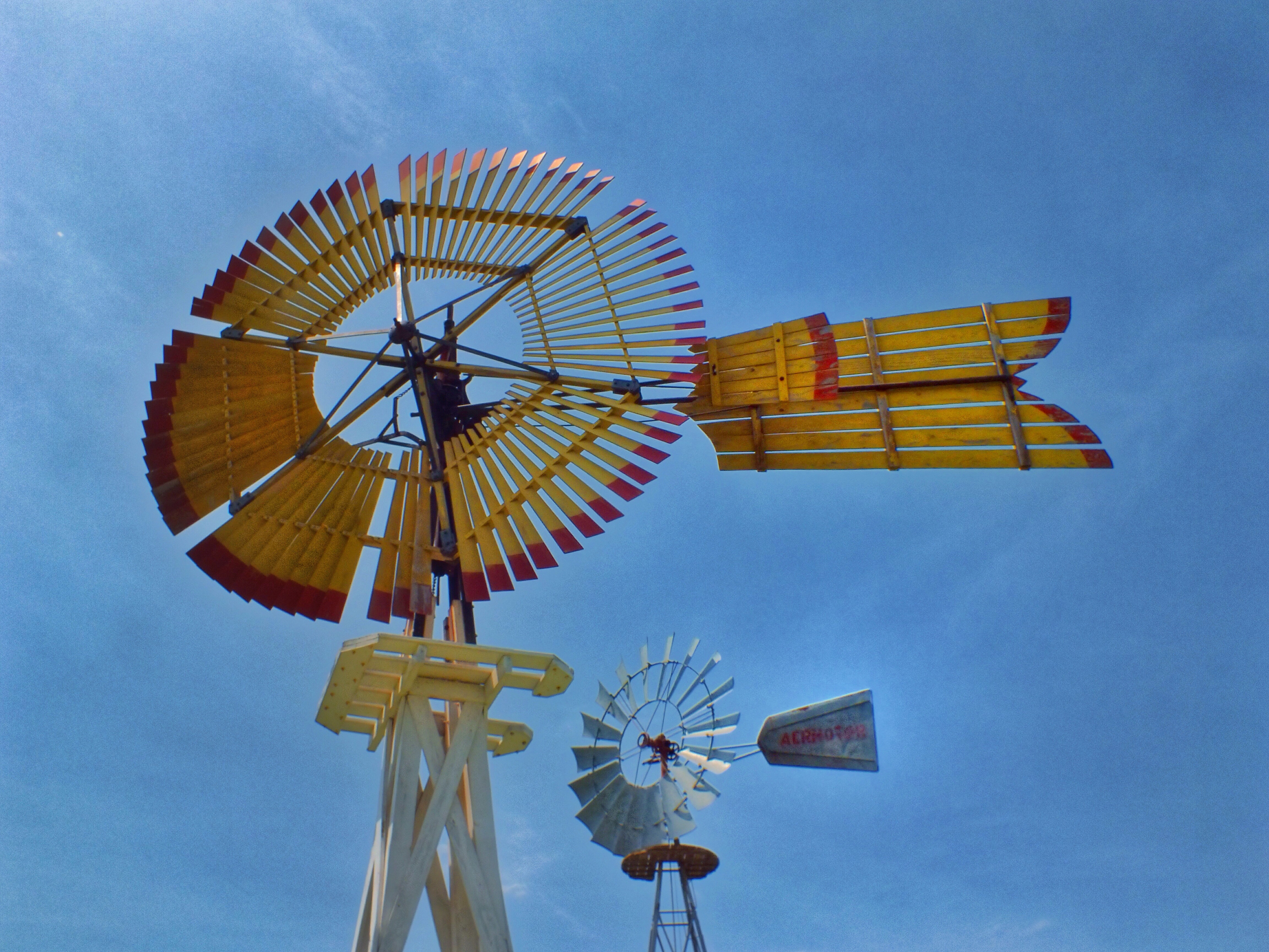 The yellow and red windmill is the Fairbanks Morse Eclipse, invented in 1867 by a reverend. It was the most common windmill before metal ones were manufactured.