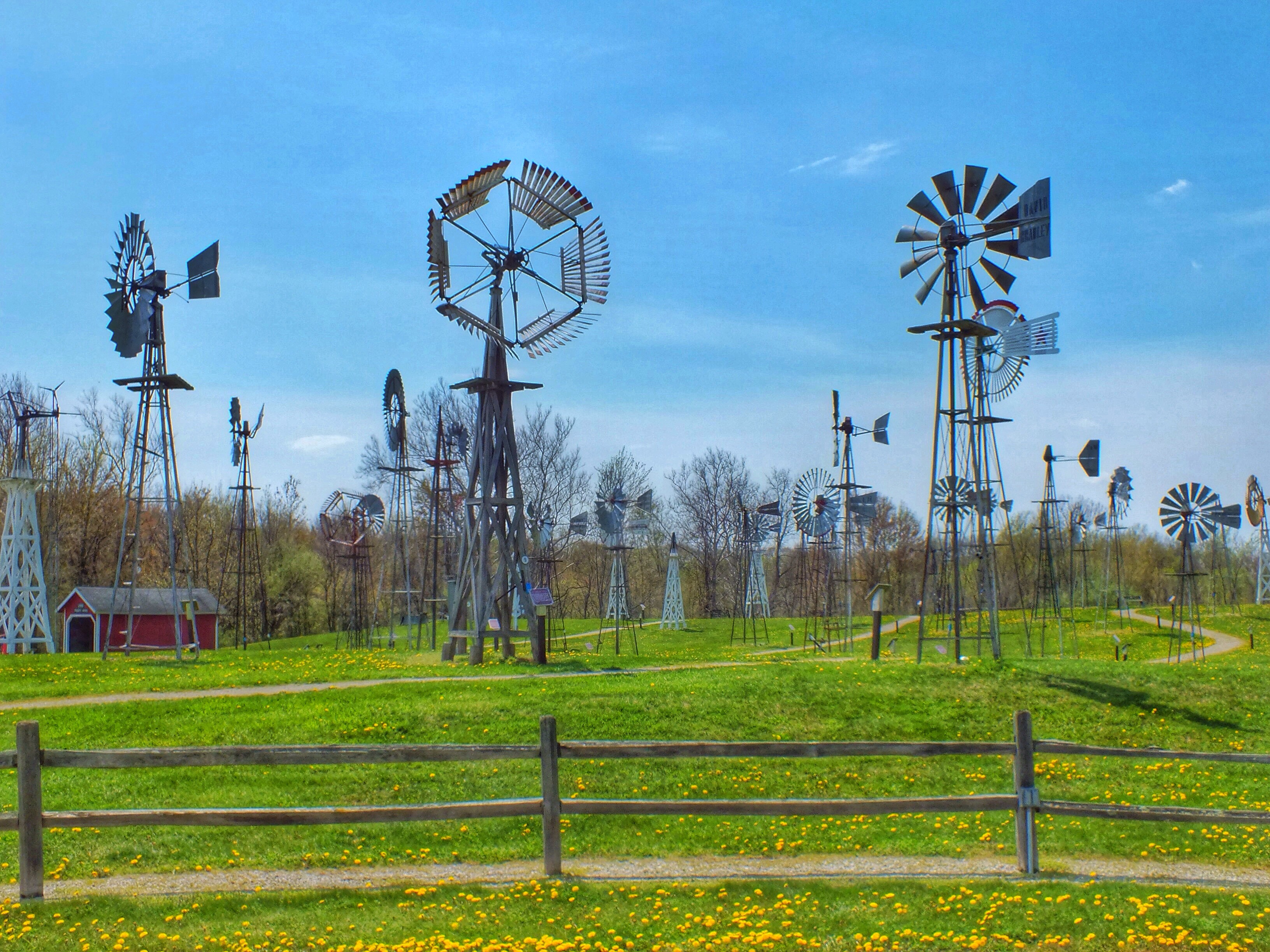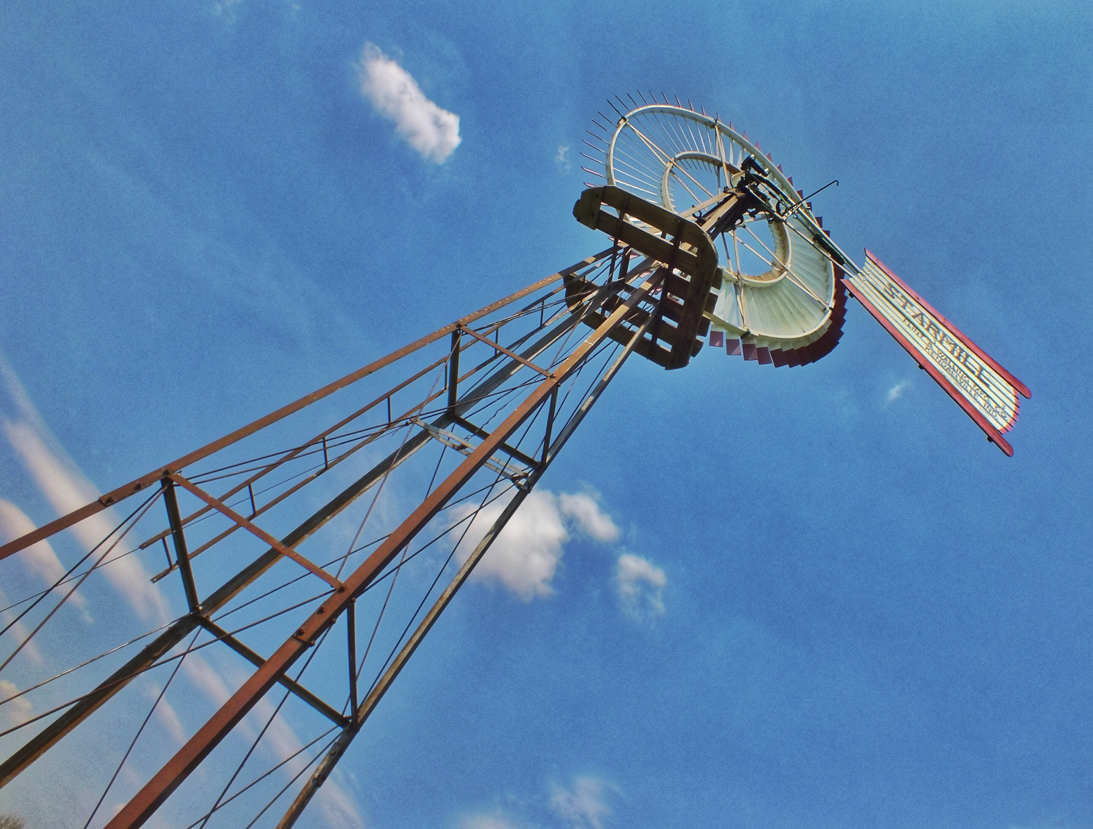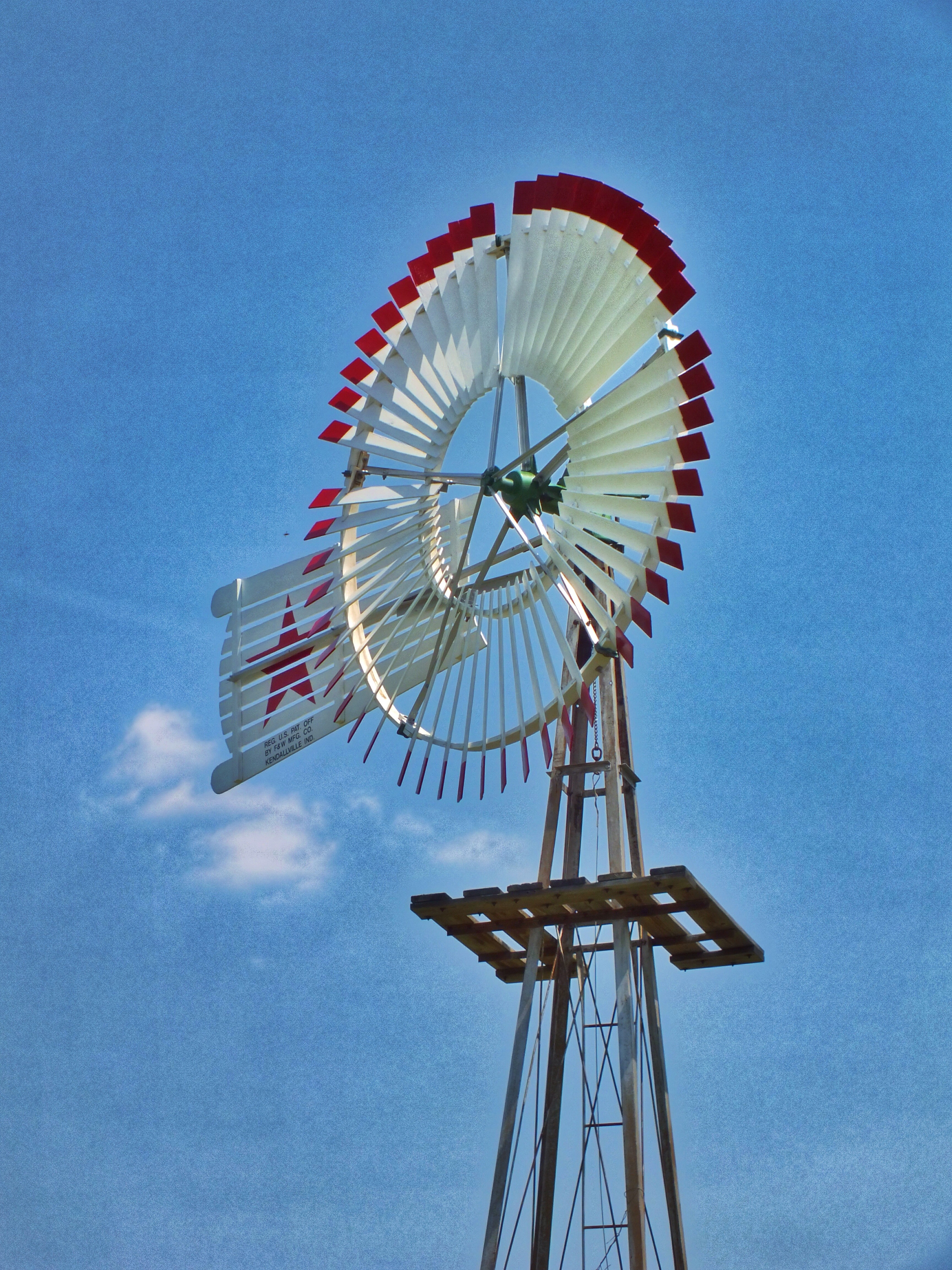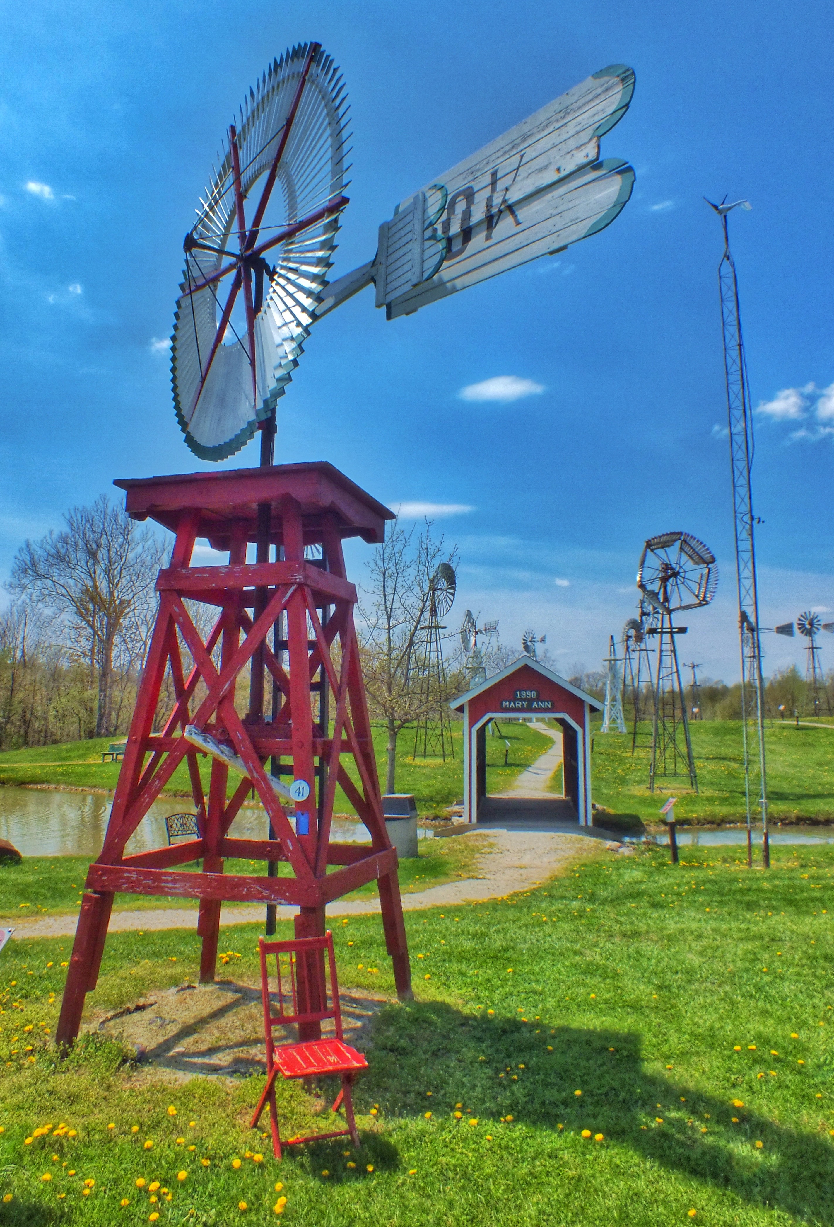 The yellow and red windmill is the Fairbanks Morse Eclipse, invented in 1867 by a reverend. It was the most common windmill before metal ones were manufactured.