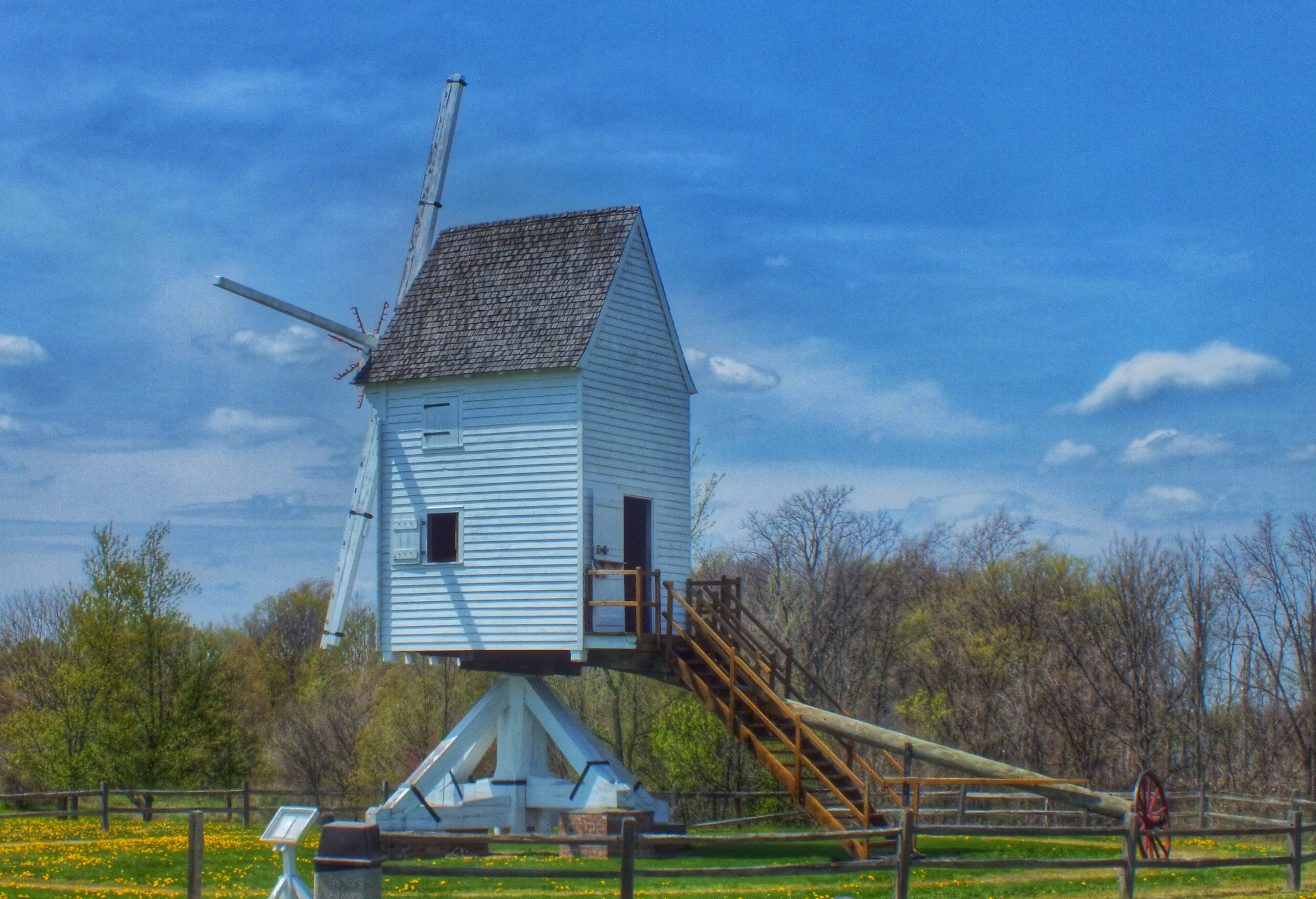 This next one is a reproduction of a Robertson Post Windmill based on plans of a 17th-century mill in Cambridgeshire, England. Mills of this type were used in the Mid-Atlantic states. The mill was turned into the wind by pushing a sloping tail pole that extends from the rear of the cabin.