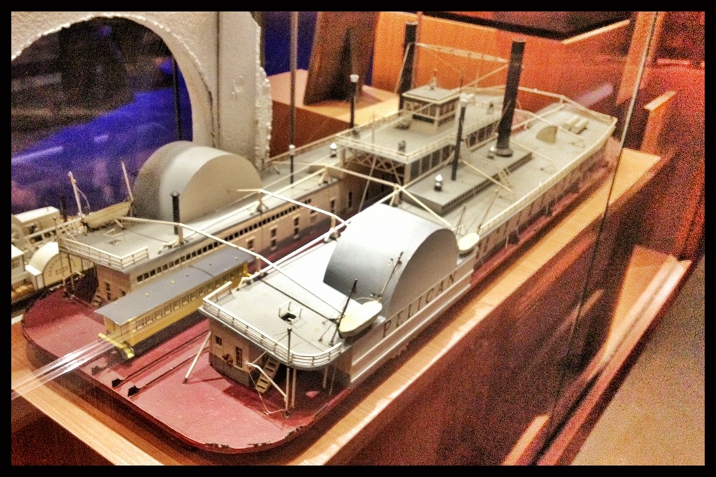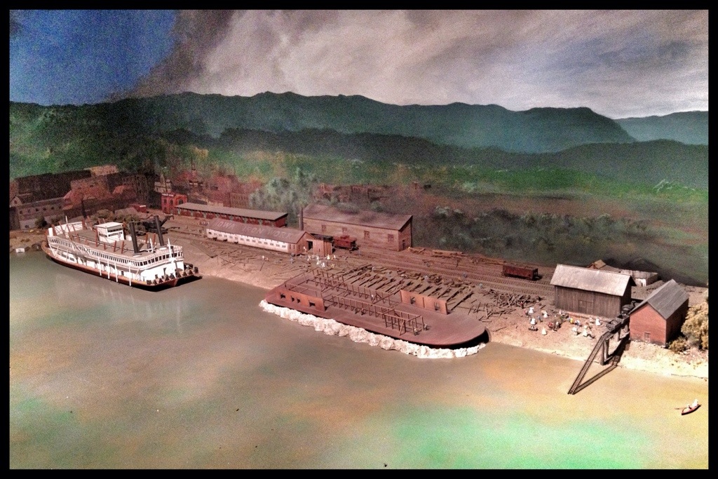 The photo on the right is of a diorama of the shipyard in Dubuque. The long, low brown building in the corner is the building I was standing in when I took this photo.