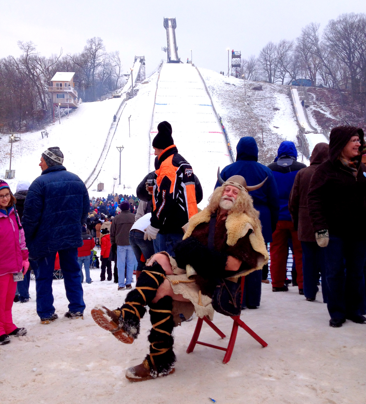 The ads for the ski jumping at Norge Ski Club on January 27 said it would last from noon to 4:00. We invited some friends. We thought four hours of ski jumping might be a bit much, so we planned on arriving around 2:00. We saw seven or eight jumpers come down the hill. Then another jumper came down the hill. Then three more all at once. And that was it. It was over by 2:30. We didn’t know this at the time, though. It was raining, so we found a place to shelter under a staircase and watched all the people in their silly hats.