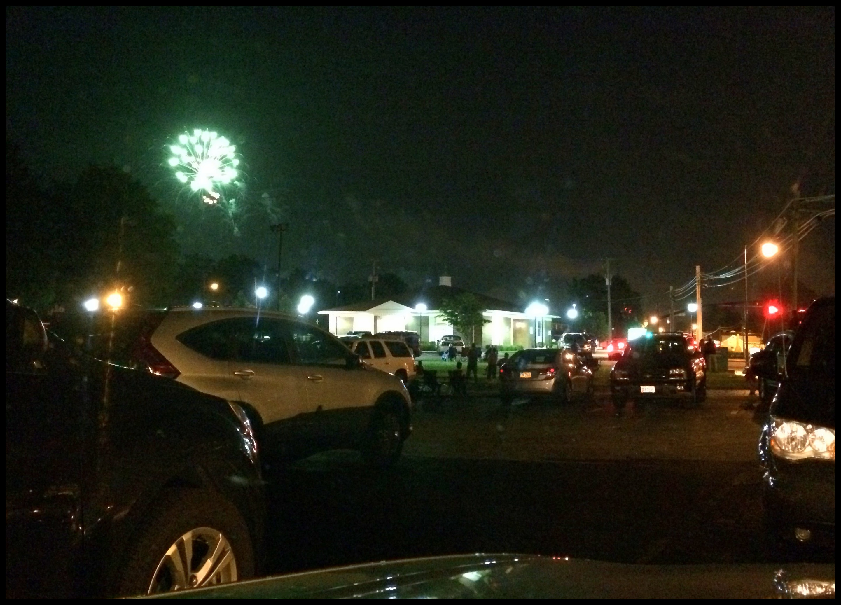 We spent the night of the Fourth in North Canton, Ohio. I discovered that the local fireworks show was taking place in a park about two miles from our Best Western Motel. We walked across the street to a Cracker Barrel parking lot to look for a vantage point, but a ridge blocked our view and the mosquitoes were out. We got in the car and headed in the general direction of the park. Several blocks away we began seeing people on lawn chairs in parking lots along the road. We found a handicapped spot in a funeral home parking lot just as the show began and settled in to watch through the windshield.
