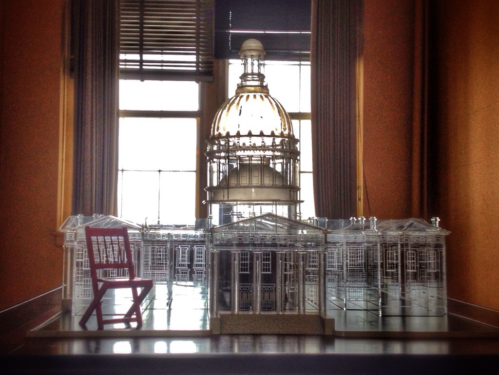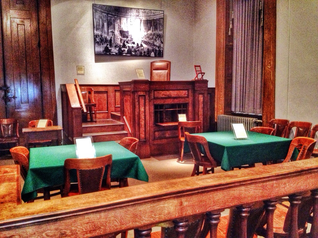 This is the room in which the Dred Scott case was tried, although it didn’t look at all like this and this isn’t the original furniture. I’m guessing there wasn’t a red chair on the bench either.