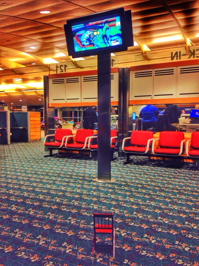 Then I went to my gate and watched awful cartoons for a while. A woman sitting a few seats down saw me take this photo. Then she walked over to where her husband was sitting and told him. He got up and walked by like he had somewhere to go, then stopped and took a sneaky look at me. He then walked back and sat down next to his wife. I heard him say, “I didn’t see it.” To which she replied, “He must have put it back in his bag.” They didn’t need to be sneaky. I would have shown it to them if they’d asked.