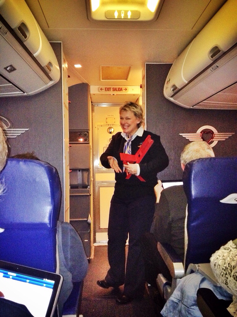 Our flight attendant had one of the funniest pre-flight speeches I’ve heard. Among other things, she kept referring to the two male flight attendants as her ex-husband and new boyfriend.