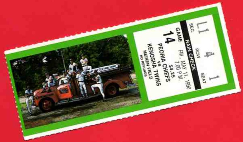 The game was exciting, if sloppy. Peoria pitcher, Henry Gomez, had a no-hitter going into the eighth inning. I won a door prize — a $10 gift certificate for the local Butternut Bread Surplus Store.