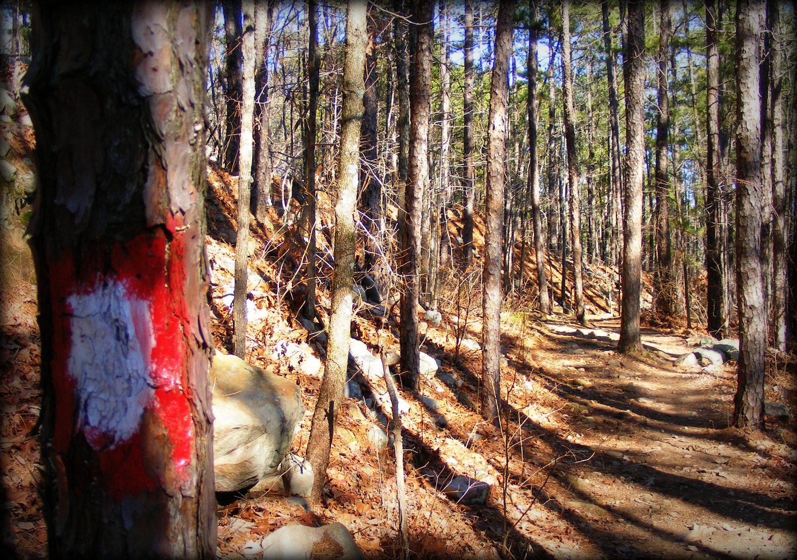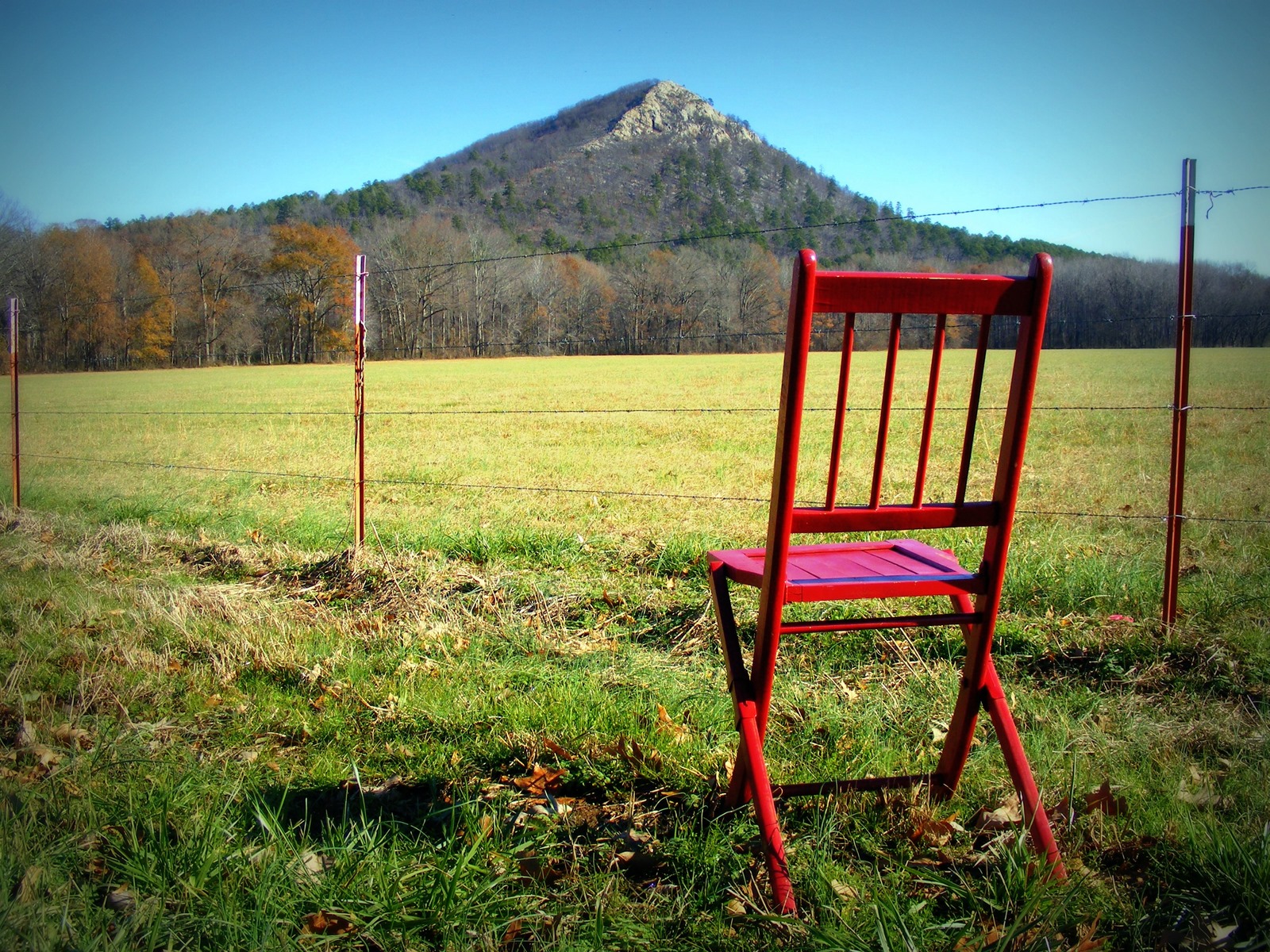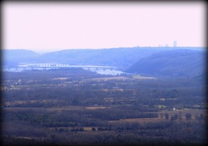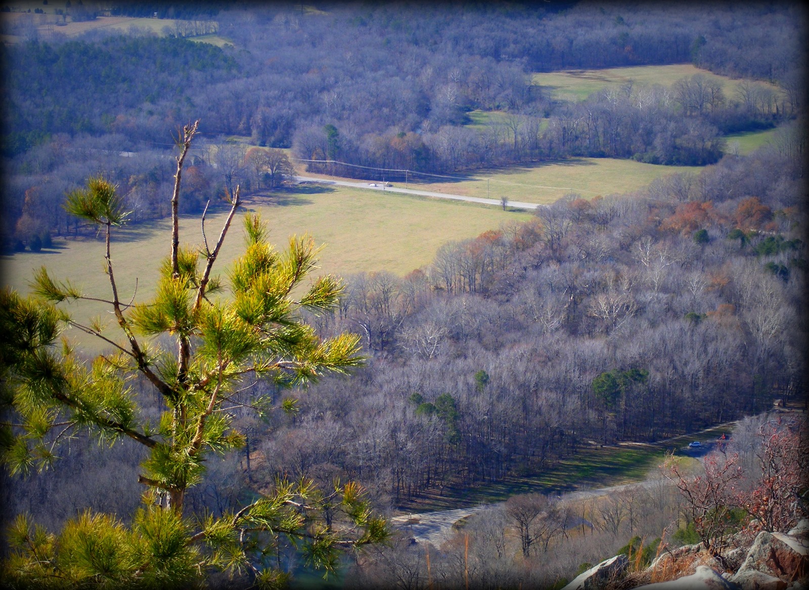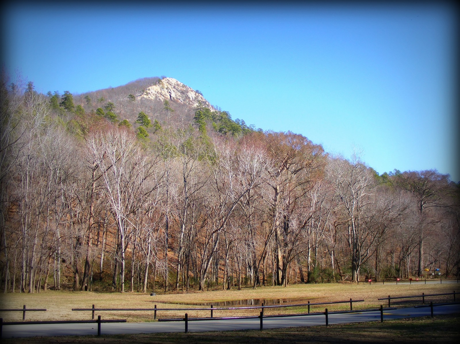 I decided to climb Pinnacle Mountain, which is in a state park about 12 miles west of Little Rock. I’d hiked the trail to the top once before, when I was in my early 20’s, and remembered it being a hard climb, so I decided before I even began not to carry the chair. I did stop along the road to get this photo.
