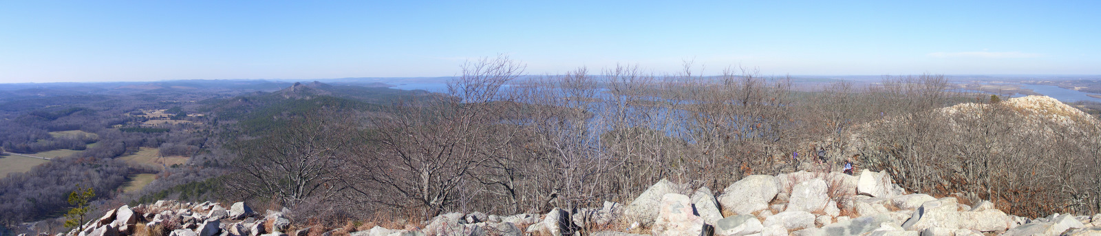 Looking northeast with the Arkansas River in the distance and Little Rock in the haze to the far right. The west summit is on the left.