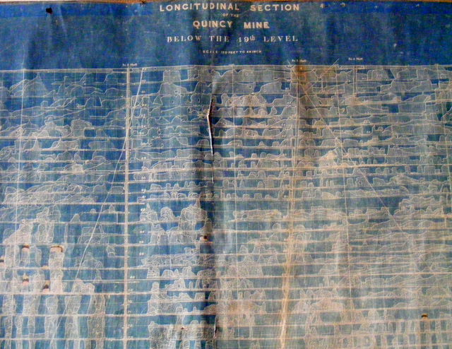 This is a blueprint of the mine. Each row is a separate level — there were 92 in all, reaching 9,260 feet into the earth. The sections shaded in white are cavities where copper was mined.