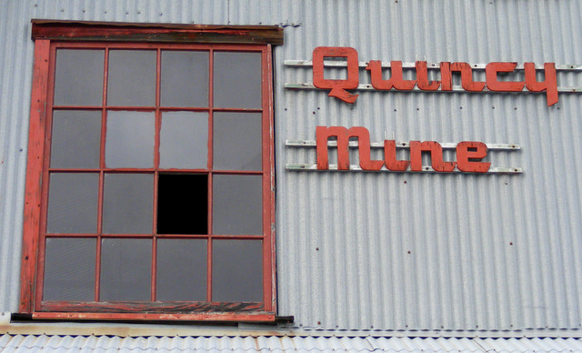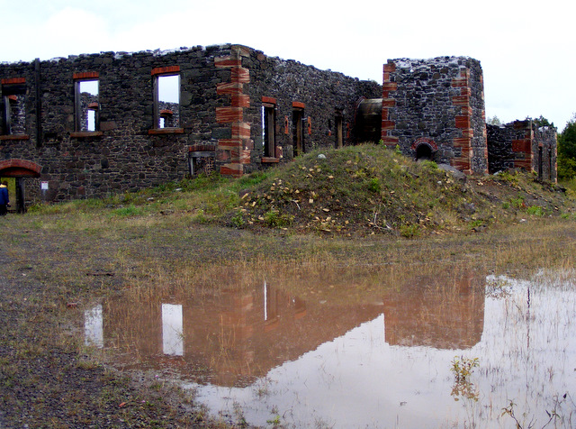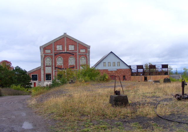 This is the Shaft-Rock House, where ore was brought up and miners were sent up and down. The cable from the hoist stretched across the scaffolding to the shaft.