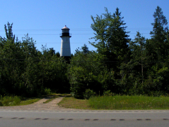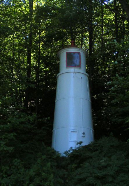 Range lights were originally installed here in 1868 to mark the west channel into the harbor. Both of those towers are long gone. They were replaced in 1914. The rear light is located back in the woods across Highway 28.