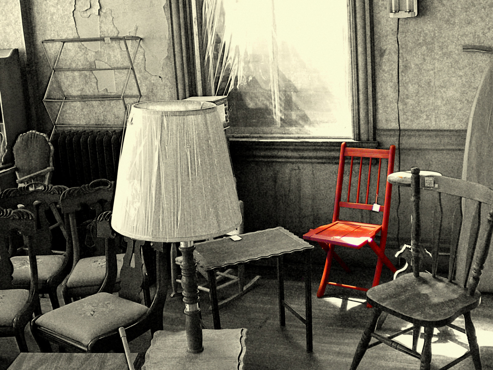 I’d been thinking about a prop for my photos for a while and had decided to get a chair. I imagined a cheap card table chair. When I drove to Freeport, Illinois, I had it in the back of my head to look for one — that’s part of the reason I walked into Luecke’s Antique Mall. The chair was tucked against the wall in the ballroom. At the last minute, I thought to take a photo of it where I found it.