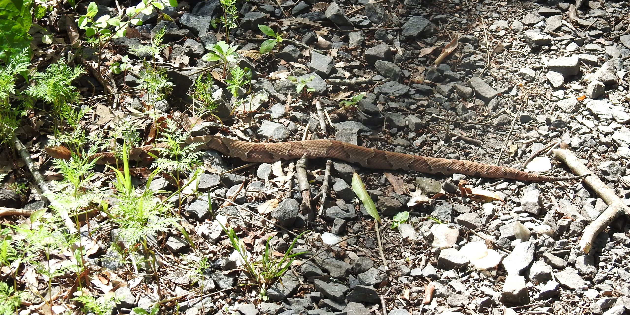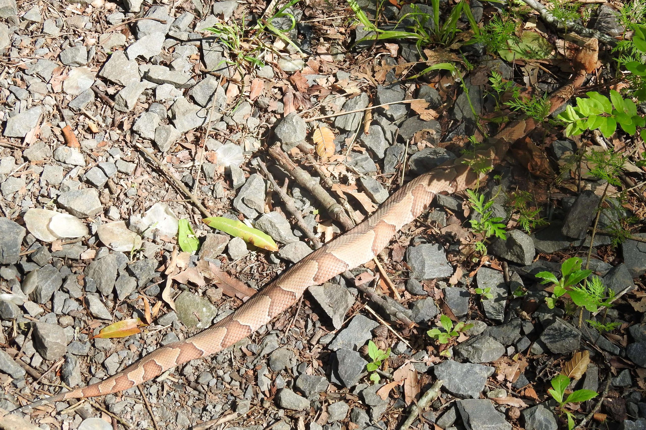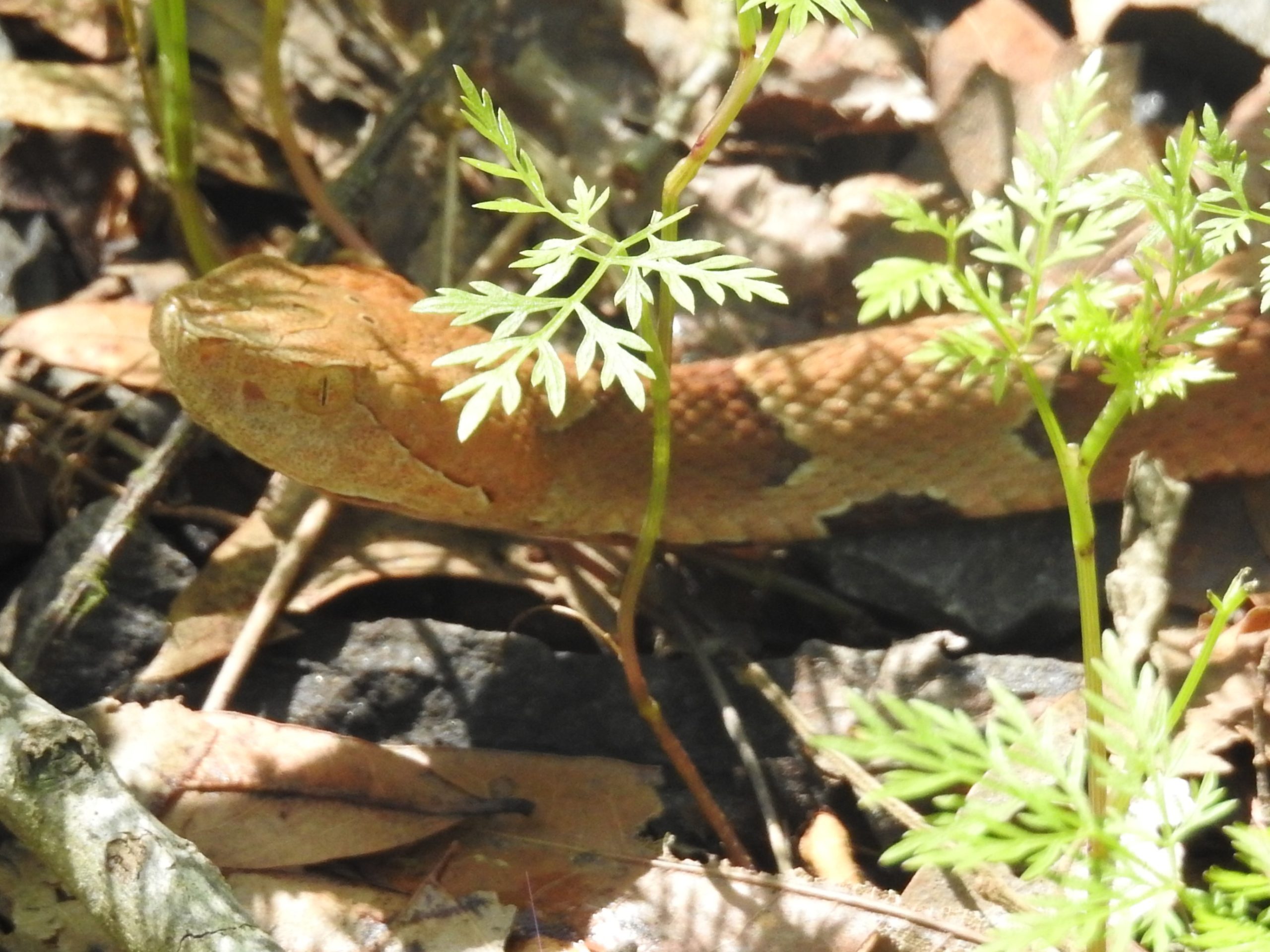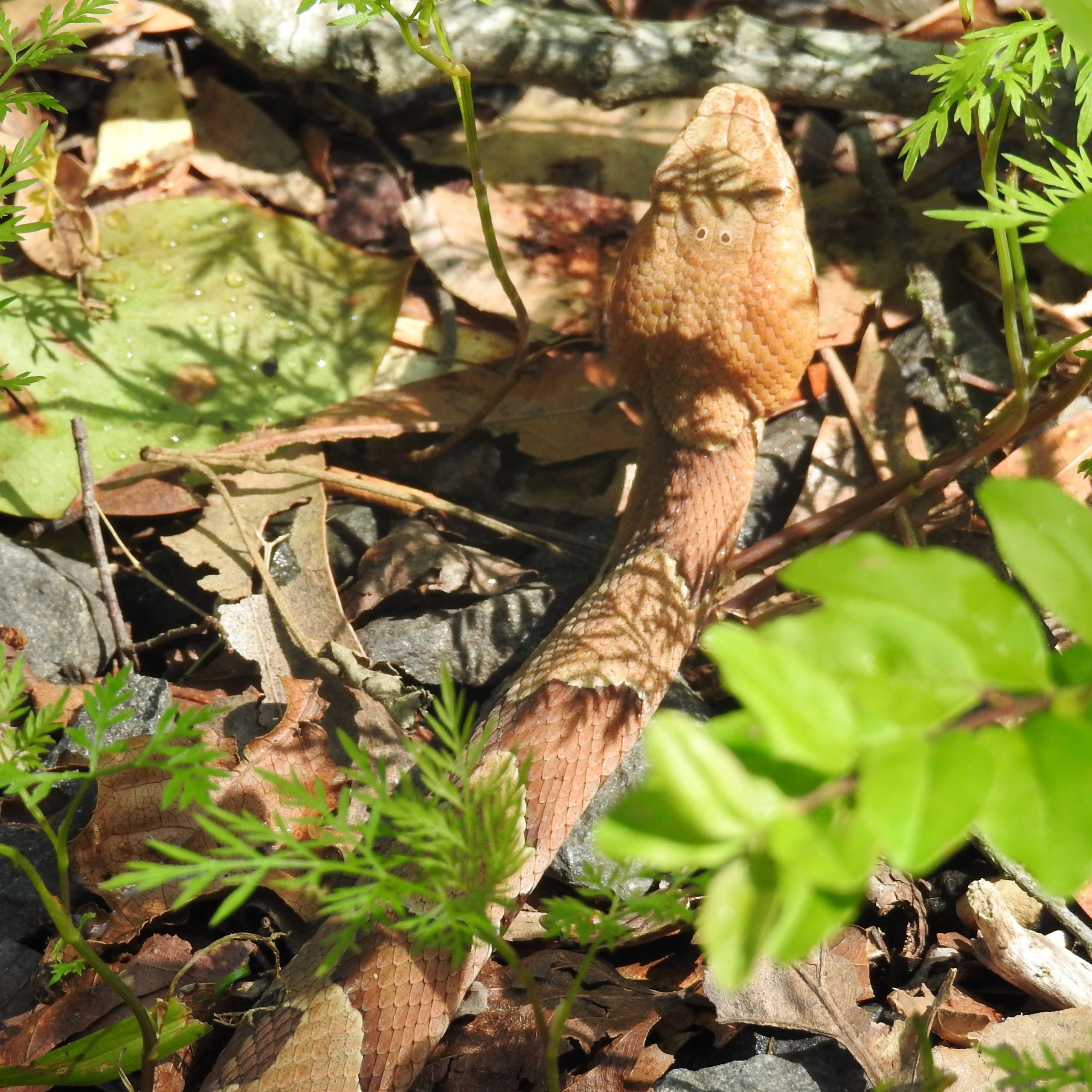 I was out birding and had just crossed over the dam on Lake Conway. On the narrow trail that leads back into the woods, I saw a Copperhead. It was stretched out, with its head in the vegetation along the trail but most of its body on the trail. I knew immediately what it was. It was perhaps 18 inches long. It never moved as I gingerly approached and took some photos.