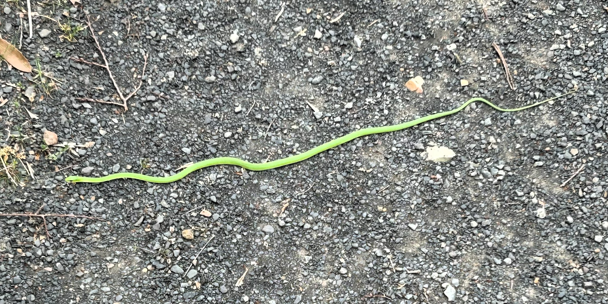 Birding along the maintenance road near the marsh, with woods on one side and swamp on the other. I spotted the snake on the road and took some photos.