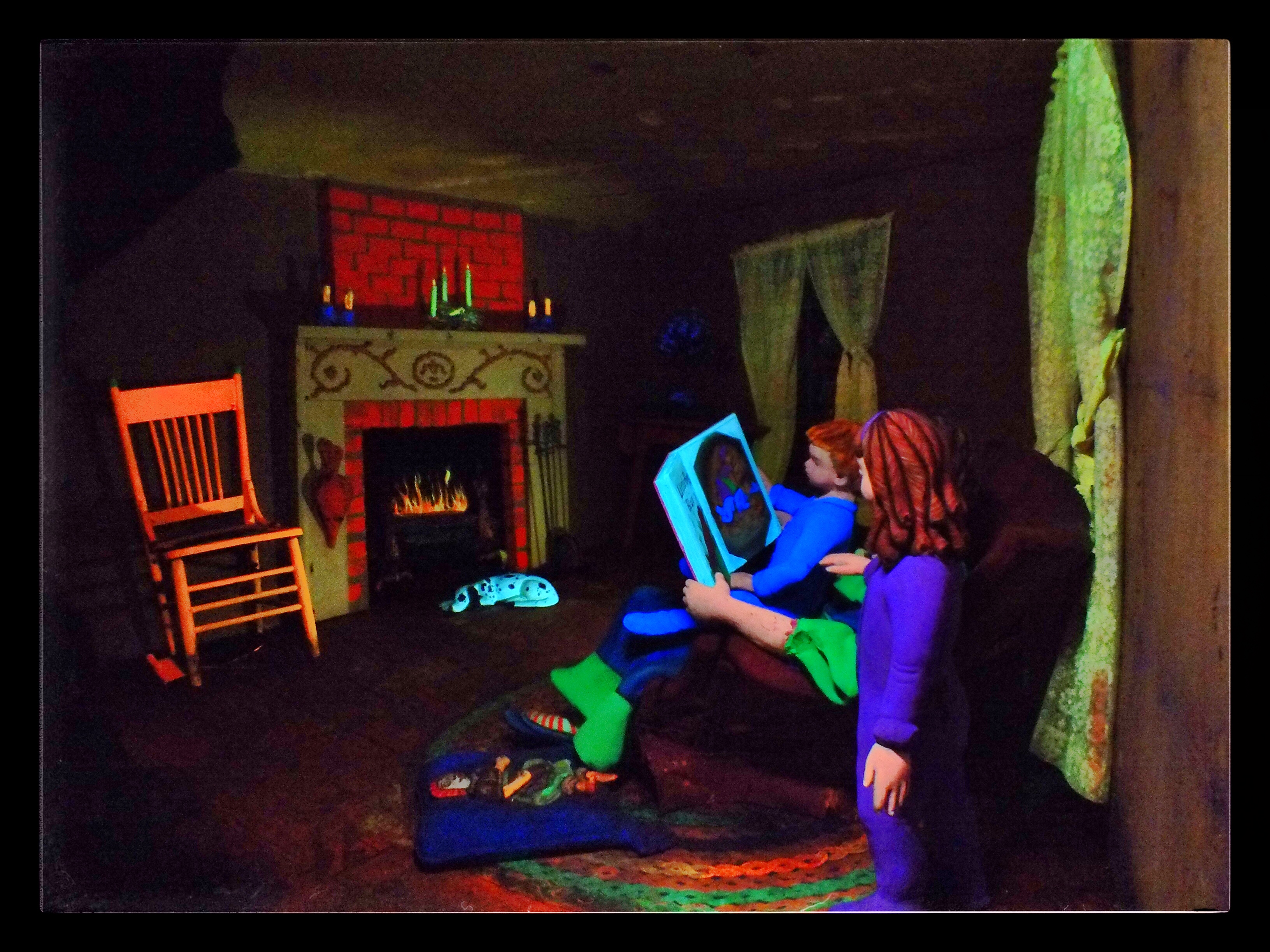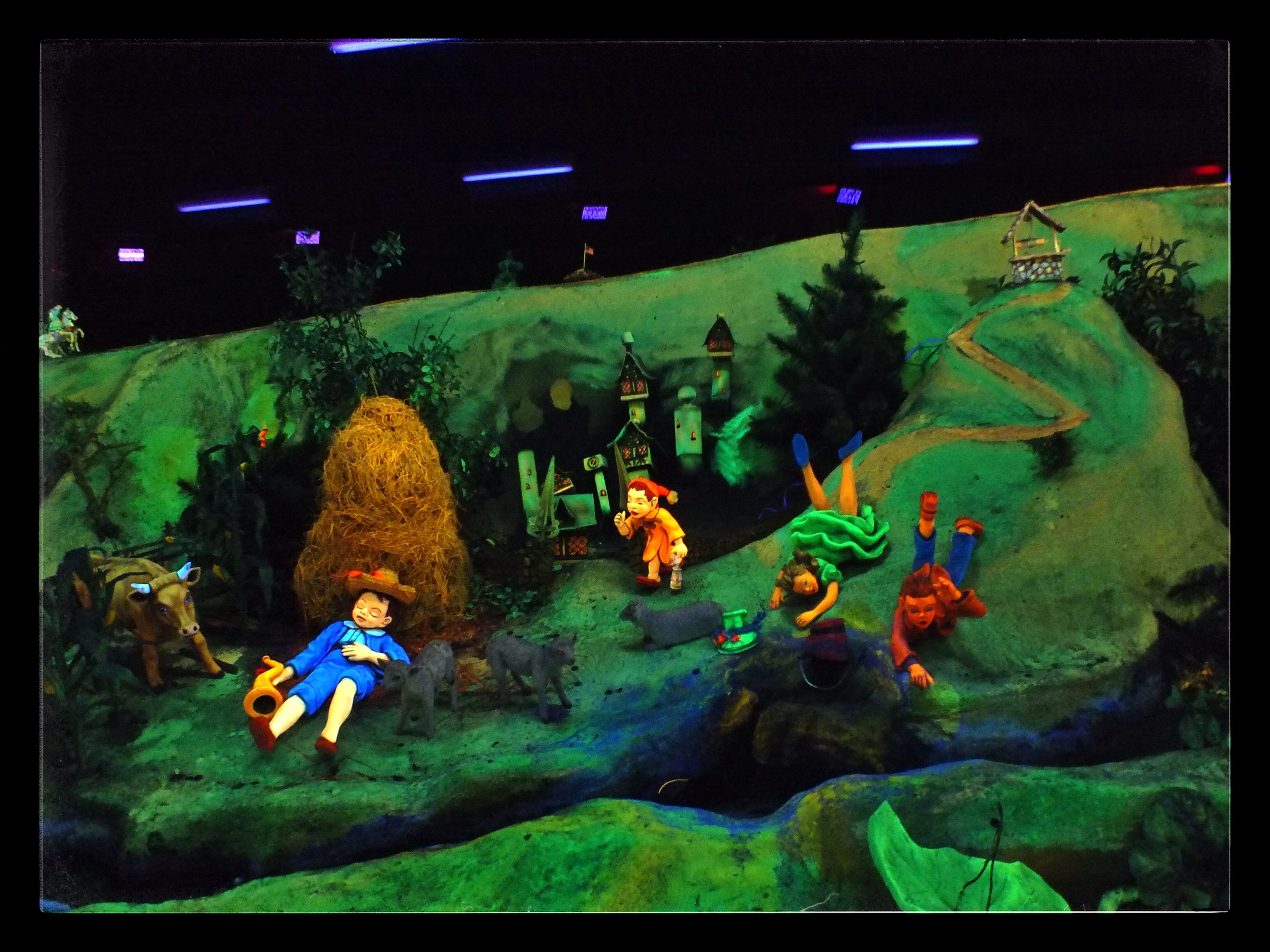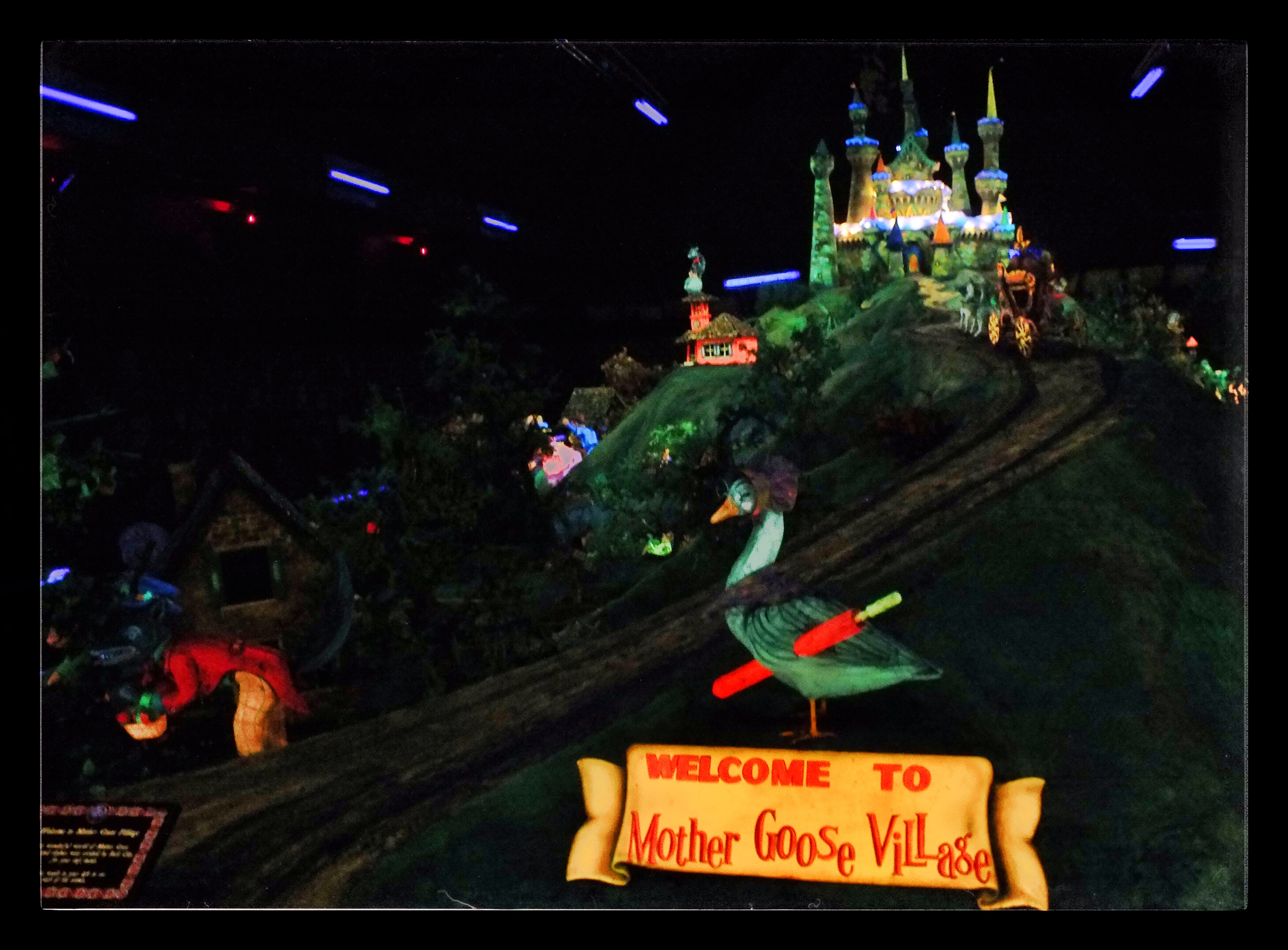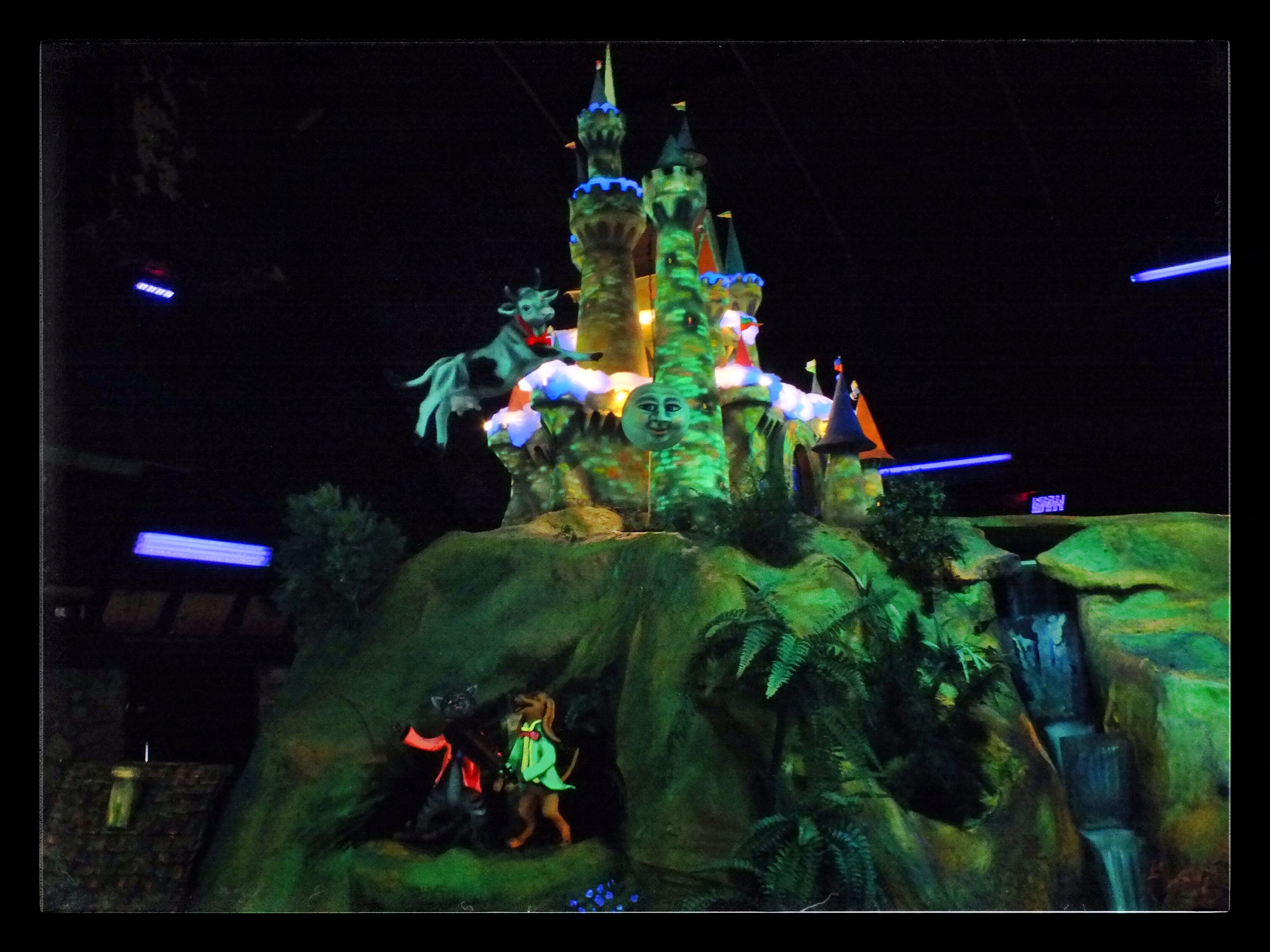 When we were here last, my daughter was four. We walked around Mother Goose Village, and then she wanted to do it again by herself. She soon disappeared into the darkness, invisible except for her white shirt that danced along eerily in the black light. She was out of sight for a couple seconds until we saw the white shirt dancing back toward us on the other side of the room.
