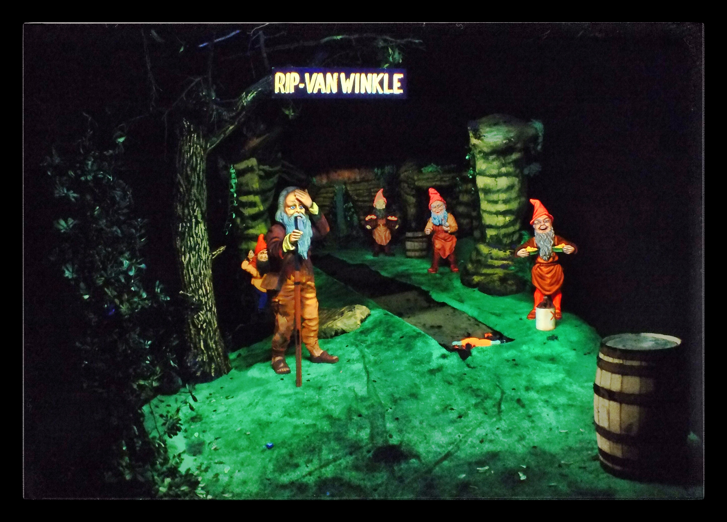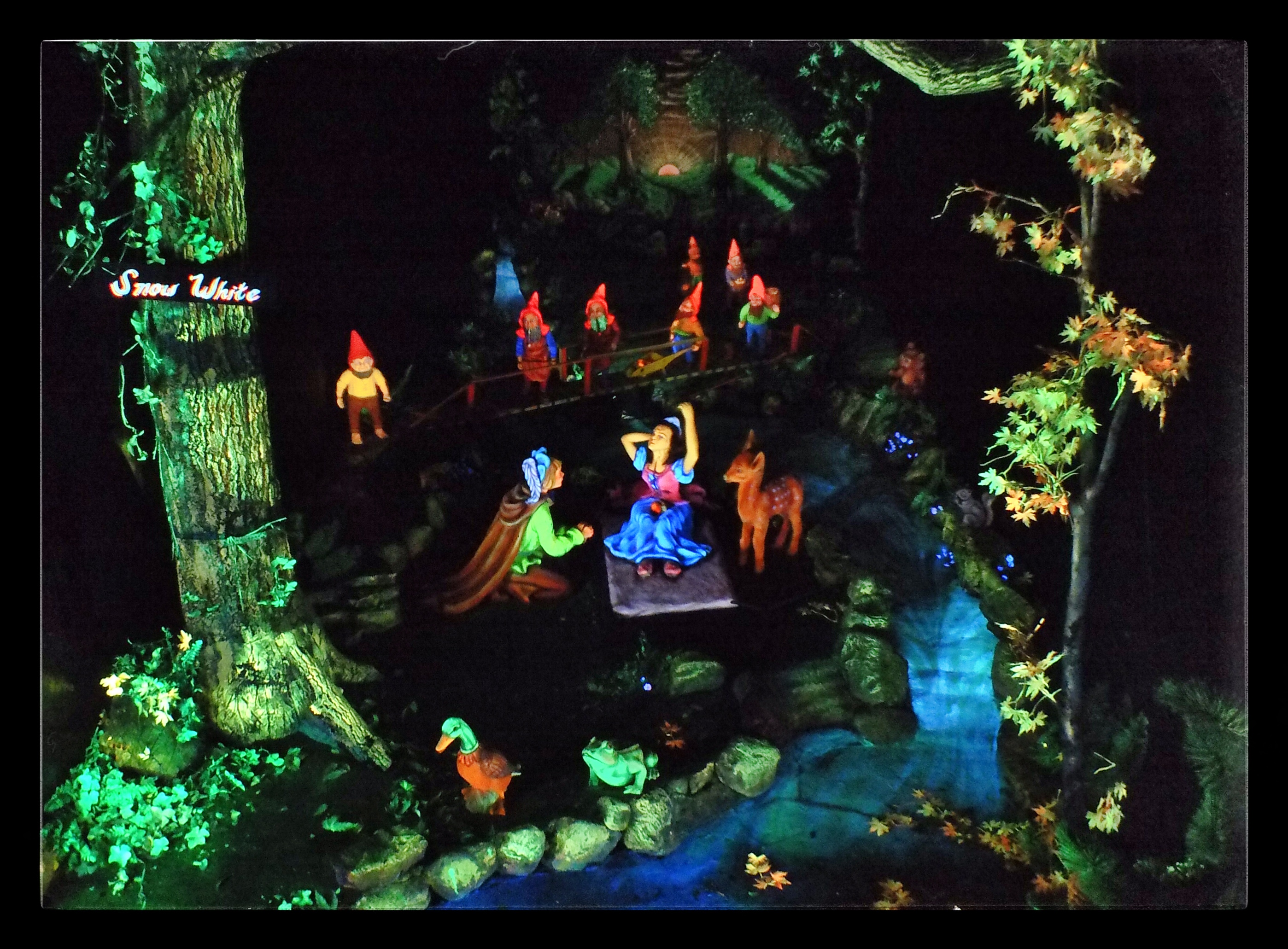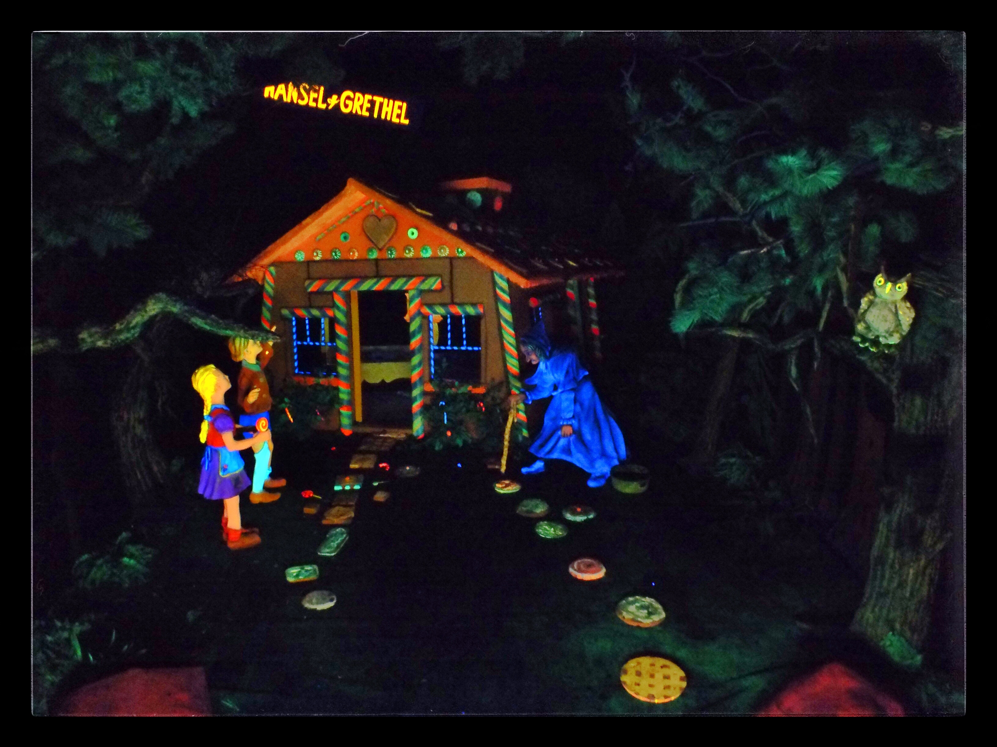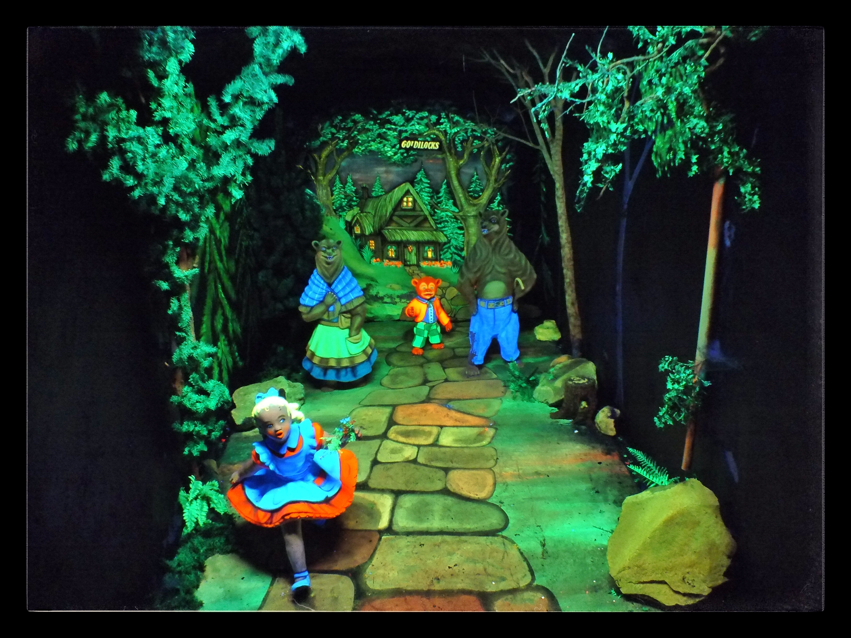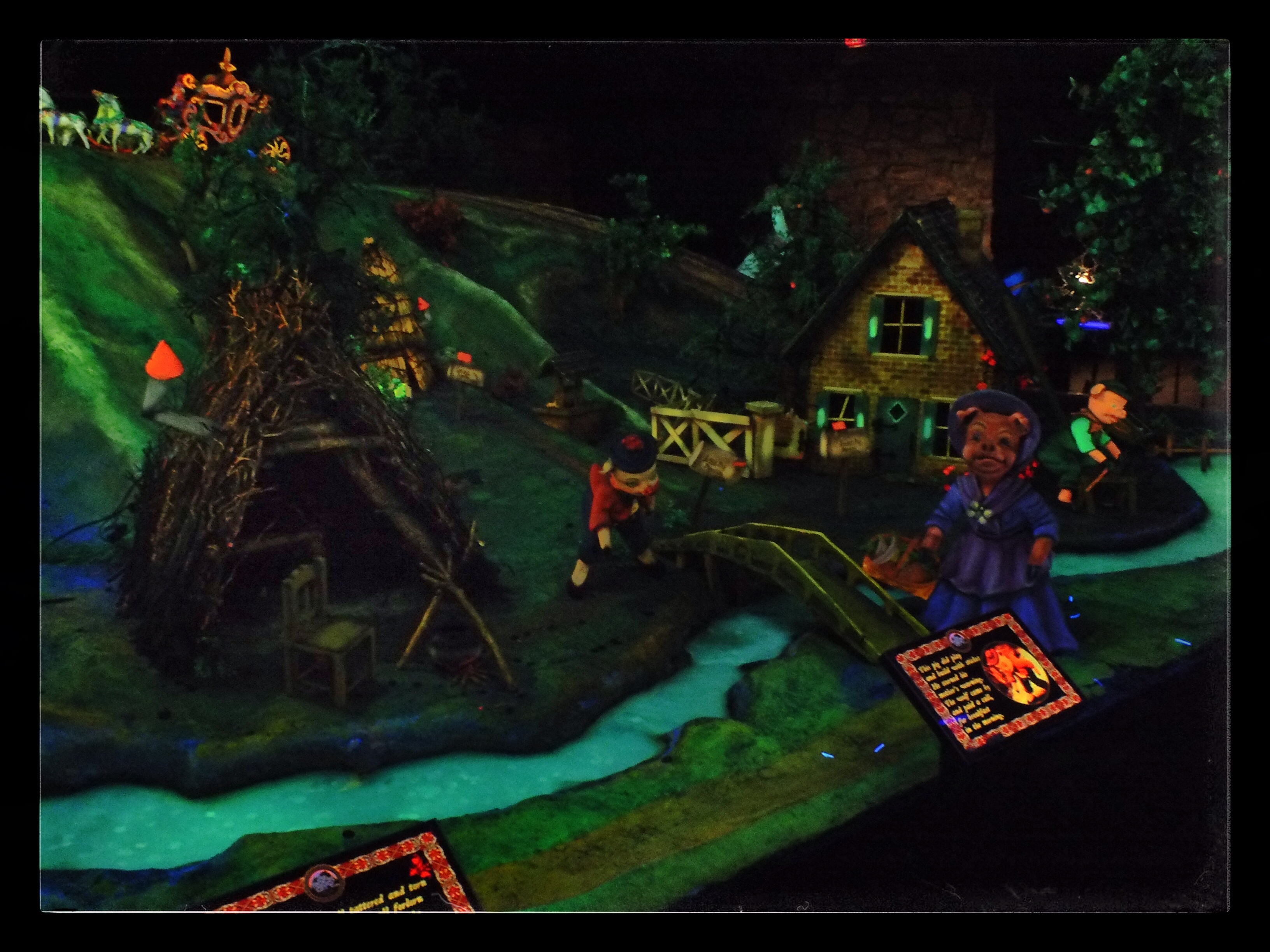 The tunnel goes on for perhaps a quarter mile. Alcoves off the tunnel contain scenes with gnomes or fairy tale characters lit with garish black light.