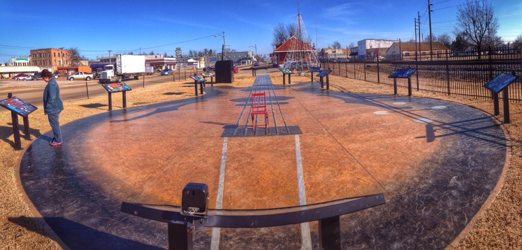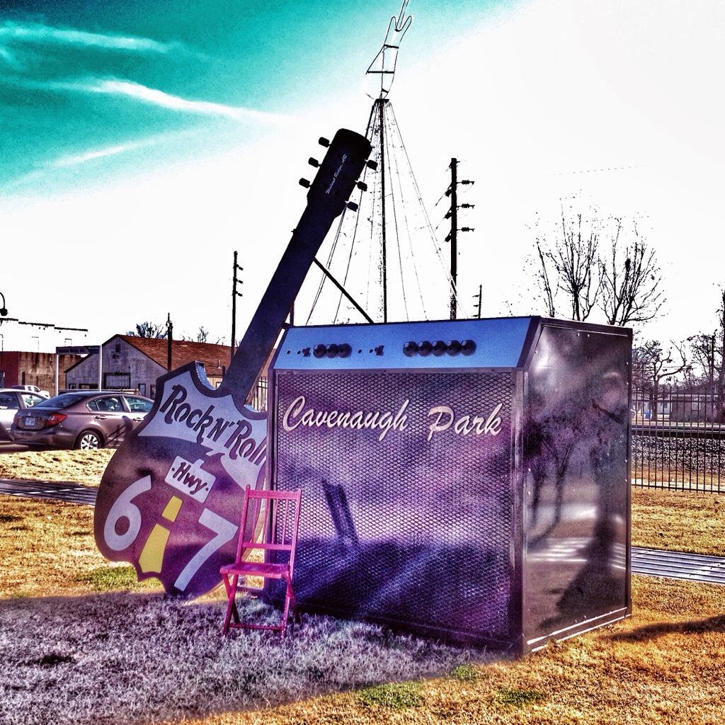 In a desperate attempt to drum up tourism, Route 67 through the mud flats of northeast Arkansas has been named the Rock ‘n’ Roll Highway. Several early artists of Rockabilly music played in the towns along the route in the 1950s, and evidently this is enough for a memorial of sorts. The town of Walnut Ridge is the first to jump on the theme. In tiny Cavenaugh Park along the road, there is a sculpture of a guitar and speaker and a walkway in the shape of an electric guitar. Around the edges of the walk there are signs telling about the musicians who traveled in the area — Elvis Presley; Wanda Jackson; Roy Orbison; Jerry Lee Lewis; Carl Perkins; Johnny Cash; Billy Lee Riley; Conway Twitty and Sonny Burgess.