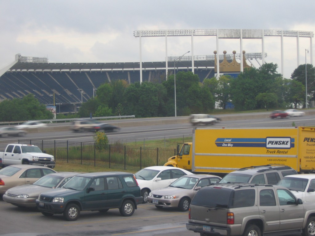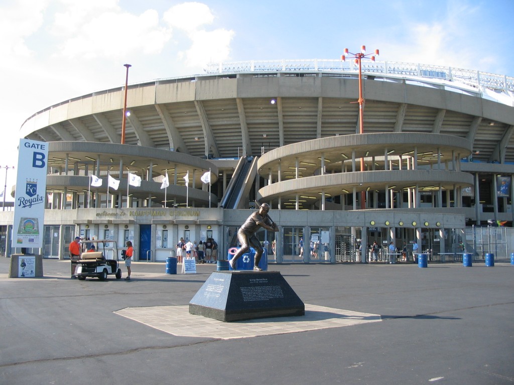 I had a night to kill in Kansas City, Kauffman Stadium was right across the street from my hotel and the White Sox were in town. It was 103 degrees, but the humidity was around 60% and it really wasn’t as hot as it sounds. I walked across the interstate on the George Brett Bridge about an hour and a half before game time. I bought my ticket — $15 for first row of the upper deck right behind home plate, then walked around the outside of the park taking photos.