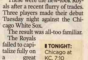 The game was pretty good. It went into extra innings before the Sox won it 7-5 in 10 innings. Joe Crede for the Sox and Reggie Sanders and Angel Berroa for the Royals hit home runs.