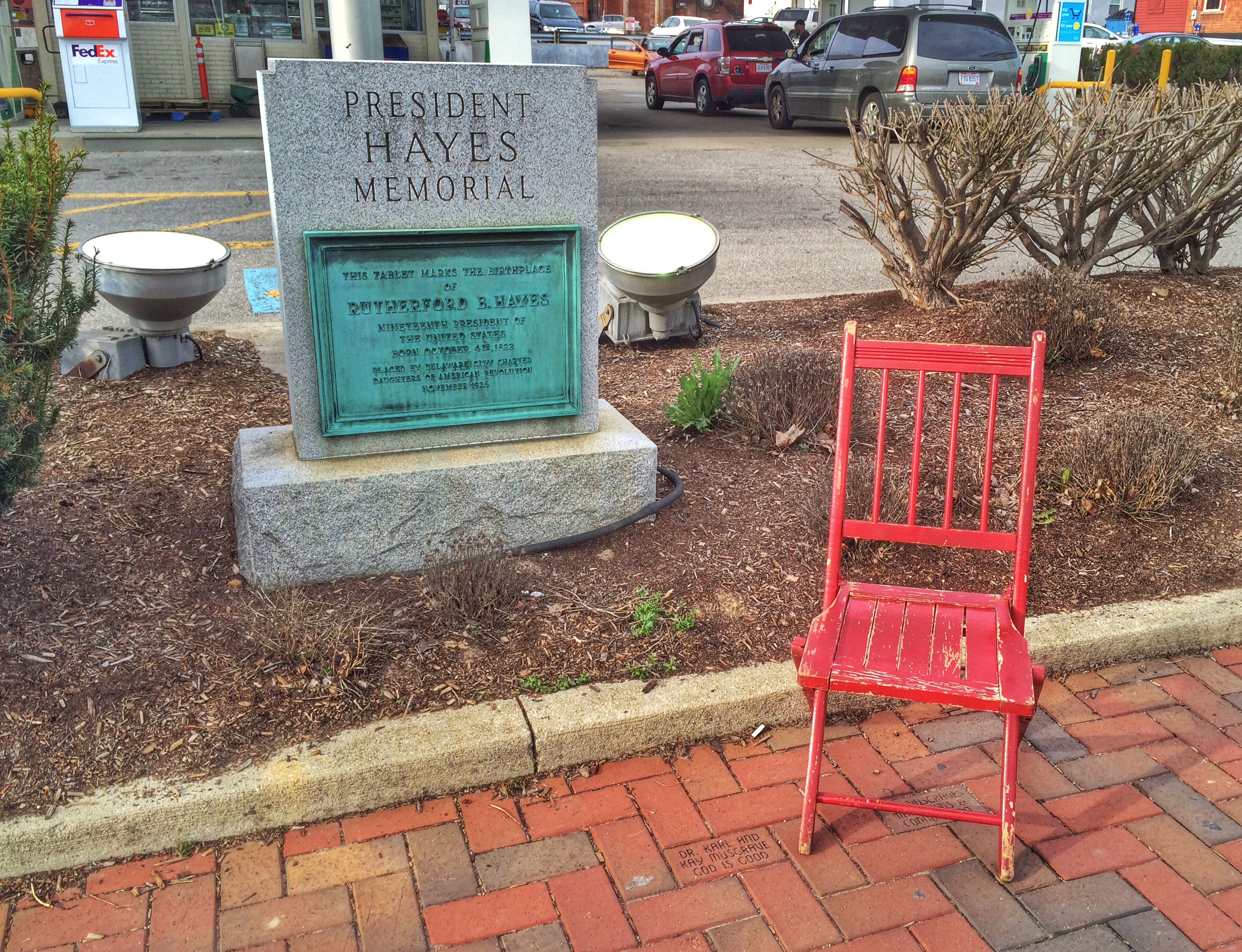 President Rutherford B. Hayes was born in Delaware, Ohio, on October 4, 1822. The house he was born in remained standing until 1926, when it was knocked down and replaced by a gas station. There is still a gas station on the site, one owned by the British, interestingly enough. When the house was torn down, a plaque was put up, but it doesn’t really give one a strong sense of history. Here’s what the house looked like.